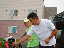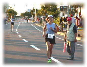 | 2003年、3回目のオロロン。無難に行けば、完走する自信はある。でも新しいバイク、自分の力を試したい。 つぶれても・・・そんな気持ちの挑戦だった。 私としては、西暦の1桁とオロロンの参加回数が増えていく予定なので、長い年月、つぶれた年もあったよなぁ〜と思い出してもいい、タニさんのアドバイスに従ってはじめからガンガンとばすぞーと思っていた・・・ 〜SWIM〜 やっぱり今年も、立っていたこのスタート。 ![]() 1時間足らずで、バイクの最終確認、トランジットの準備、補給食の確認、荷物の預託等々、あわただしく、うでにナンバーを書き込んでもらい、いっぱしのトライアスリートの気分を味わうまもなく、スイムのチェックイン。 試泳を終えるとあとの30分はただスタートを待つのみ。 なぜかオロロンはおぼれる気がしない。(昨年は平取でスイムリタイヤだったので・・・スイムは苦手)地元ブラスバンドの演奏に拍手を送りつつ1分前。 えっ!もうスタート?やっぱり立ってたかぁ〜今日1日楽しもう!スタートラインに立っている自分にまずはエールを送る。 今年は、集団の中に入り、たたかれながらも泳ぐ。その甲斐あってか、スイムからあがると38分台。去年より3分も速い!目の前には高谷会長!シャワーも浴びずトランジット。なかなかウエアーの背中がおりてこない。 湯上がり状態?みかねた近くのお兄ちゃんが下げてくれて・・・(これって反則?)バイクスタート 〜BIKE〜 何かまわりの雰囲気が違う。まわりのバイクが速い。 マーシャルがいる。谷さんの「はじめから、とばしていけ!」のアドバイスが脳をかけめぐる。足の回転を気にしつつ空の青さと海の青さに感動。記憶に刻まれる1日になるに違いない。 昨日、車を置きに羽幌まで走り、イメージトレーニングをしたコースが、早回しですぎていく。30キロ、高谷さんが見えた。ついて行けばいいところは行く。でもより高い自分を求め、高谷さんを抜く。抜いたからには、もう引けない。 谷さんの「小平の直線は、心地よい回転数で、回すんだ」の声が聞こえる。 追い風ならアウターで4枚目と決めていた。やや東の風で1枚軽くする。でも平均時速35キロはでている。ほぼイメージ通り。 苫前に入り、やや坂が出てくる。「ヒロコちゃーん」耳慣れたケイコちゃんの応援に思わず、「あたし、がんばってるよ!」と答えた。石やんの車が遠慮がちに過ぎ去った。 もうすぐ今日のゴールの羽幌だ。今夜の宿泊ホテルが見えた。といってもあとバイク約130キロ、ランの全てが残っているが。 「ナンバー6」優待選手の服部さんだ。下りで簡単にこしてしまった。どうしたのかと一瞬、思いつつもそれ以上考えることもできず、ただ自分の精一杯に挑んでいた。 頭は、あまり働いていないが、一応は、小学校の教員なので、子どもたちの応援には手を振って応えるようにしている。 後方から子どもの声、手を振ると、7月に札幌に来た姪っ子(姉一家)の乗った車がコマ送りで右を過ぎ去る。思いがけない応援にジンとくる。 あのウエアーは・・・!棟方さんだ!横に並ぶと、谷さんもシンちゃんもまだ来てないと言う。予想以上に好位置らしい。 棟方さんを抜くが、すぐに抜き返される。このあたりから、力がでない。「いいきになって、とばしすぎたなぁ〜」と反省しつつ、足を回した。 それでもなんとかサロベツ原野を抜け幌延の役場前を通過。風が変わる。 前半のとばしすぎがたたっているのに、さらに風、失速してどんどん抜かれる。こうなると、さっきまでの前向きな自分は、もういない。 「あーやめたい」 とりあえず足を動かす。「やめたい」「やすみたい」「おしりが痛い」さまざまなマイナスイメージが頭をうごめき、女子3人に抜かれる。 女子6位。さっきまでは、3位だったので・・・。見知らぬ車も「加藤さん女子3位、4位の○○さんとは、○分差」などと教えてくれる。 さっきまではうれしい情報も抜かれるたびに辛くなる。でもリタイヤは絶対しない。あきらめない。このことを昨年の平取で誓ったので、「やめたい」わたしを「あきらめるな」のわたしが励ました。 ゴールを刻む標識が見え始めた。バイクで、抜きつ抜かれつした選手にあいさつをし、遠別道の駅に滑り込む。トランジットバックを受け取り、更衣室へ女子選手が2人。和やかに話をしている。 必要最低限の着替えをし、補給食を手にランスタート。 ![]() 〜RUN〜 姉一家、マッキーさん、島津さんの声援を次々うけランへ。これで女子4位。 はじめは、キロ5分30秒ほどで入ることができた。5キロ?のエイド前で、歩いている棟方さんを発見。「今日はもう歩いていく」とのこと。「棟方さん。がんばれ!」の言葉だけ残し、追い越す。 好位置なせいか、前の選手との差が大きく、なかなかつまらない。太股に痛みを感じる。塩分不足?はじめて味わういやな感じ・・・顔をなで、きれいそうな部分の塩をなめる。 女子選手を発見、旭川の人だ。なんとかこせた。これで女子3