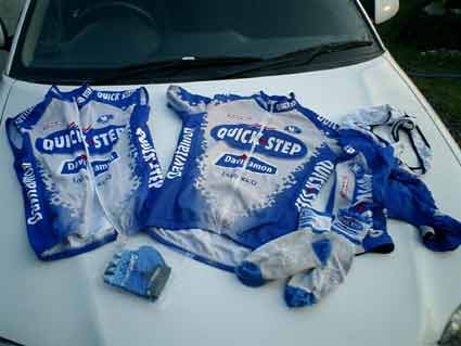 レース後は、チーム員一丸となってのウエア類大放出。クイックステップとランプレが売りに走っていた。