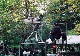 中継カメラ。ポータブルではなく、生放送のための大型カメラが使用される。