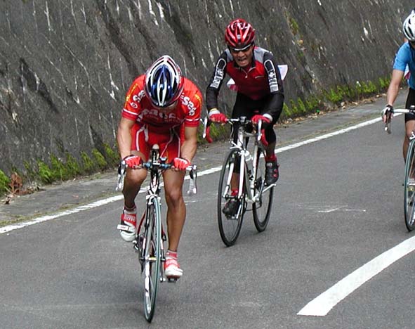 チャレンジレース、古賀志林道を上る自分(赤いサエコジャージ)。2周目。