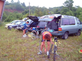 第50回記念大野〜江差チャレンジラン、初トライでした。今にも降りだしそうな空模様の中、約25名が時差スタート。 函トラチームは2分遅れの第2スタート、MAE、SHIN、HIROと3人で廻していく作戦、峠のトンネルまでの登り、HIROの息づかいが荒い、前日の練習疲れ、それとも飲みすぎ?それでも根性娘は3人の輪から外れることなくトンネルを通過、後はほとんど下りだから大丈夫。 江差手前で雨が降ってきた、前車の巻き上げる泥水が顔のもろにかかり、口の中がジャリジャリ、顔をそむけての走行はえらく疲れる。 鴎島折り返し地点のエードで補給と排尿を済ませ、復路のスタート。 3人の息もだいぶ合ってきて、順調に廻して行くが相変らずの前車の泥 水がいやだ!バンダナで覆面でもすればいいのなあ?それともフルカウリングのヘルメットとか・・・。そんなことを考えながら走ってるうちにもうトンネルの手前だ、終盤にきてこの坂は相変らずきつい!途中千切れそうなりながらも何とかクリア。 トンネルを抜けて、さあラストスパート、廻すタイミングを早めながら全力走、だが、このタイミングがわからず、何度も置かれて行かれそうになる、それとMAEちゃんのサドルバックが落ちそうになってて、ブラブラ状態、それも気になる。 残りわずか、両脚はパンパン状態、でもさらにスピードアップ、MAEちゃんの指示で前走者を一気に抜き去り、3人一緒に無事ゴール、タイムは3時間39分11秒でした。 マッキーズのふーさんは目標タイムを軽くクリアーの4時間9分9秒でゴールでした。 ![]() |