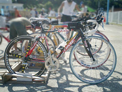 素の完成重量7.5kg(前後輪キシリウム時) フレーム:タイム VXRモジュール メインコンポ:シマノDURACE 9Speed クランク:シマノ10Speed ハンドル:デダ・ニュートン31 DHバー:デダ・クリップブラック ステム:タイム シートピラー:タイム サドル:セレイタリア ホイール前:マヴィック キシリウムSSC-SLクリンチャー ホイール後:スピナジ− REV-X チューブラー タイヤ前:ミシュラン Proレース(7気圧で使用)max8psi タイヤ後:ヴィットリア Evo-KX(12気圧で使用)max14psi ペダル:タイム インパクトマグ メーター:シマノ・フライトデッキ |