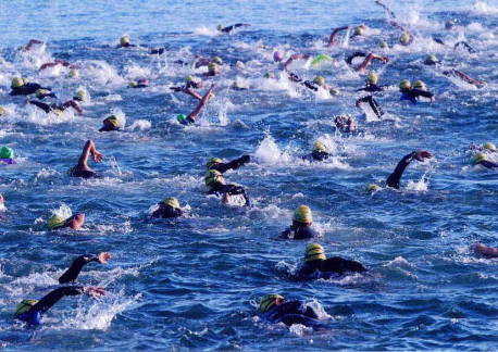 長い1日の始まり AM6:30増毛港に響き渡るピストルの音と共に、今年もオロロンの幕が切って落とされた。トップ選手や泳ぎに自信のある選手が先を争って海へ飛び込む。第一種目のスイムは増毛港の特設コース。オーシャンスイムでは、プールにあるコースレーンを区切るロープはありません。あるのは目印となるブイのみ。このためプールでは使わない技術も必要。たとえば目印に向かって泳ぐために水面から顔を出して前方を確認するクロール「ヘッドアップスイム」。アテネオリンピック女子トライアスロンでは、トップを泳ぐタオルミナ選手(アメリカ)が三掻きに一回の割合で前方を確認していたのが記憶に新しい。海面ぎりぎりに目線をおいて、一瞬で前方を確認するためには慣れが必要。あらかじめ陸地の建物が、どのように見えるか公式練習時間にシュミレーションしておくことも必要。陸地から見る景色と海面ぎりぎりから見る風景はかなり違います。慣れないひとは平泳ぎを入れて目標物を確認しましょう。 300名の選手がコースロープの無いところを混泳するため、集団内ではフックをもらったり、蹴られたり、時には速い選手に乗られたりもします。しかし、後方で泳げば安全に泳げるので安心を。そうは言うものの、今年は集団内でスタートしちゃいました。集団がバラケない最初の10分で早くもフックをもらう。「ありゃりゃ」ゴーグルがずれてしまったではないの!立ち泳ぎしている間も、次から次ぎへと選手が押し寄せるので、素早くゴーグル内の水を出して再スタート。例年は、最後尾から海に入るので、こんなことは無いんですが・・・。