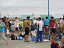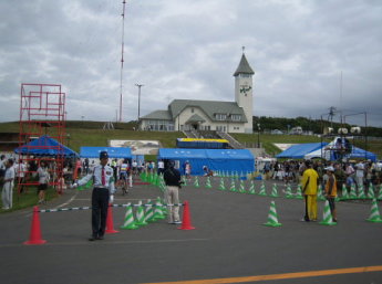 あれは2月だっただろうか?かみんぐ(上磯町営のプール)で、ターンをした瞬間”リレーのスイムなら!”とひらめいた。2005年になり、オロロン参加表明者が続々・・・オロロンの1週間後に開催されるアイアンマンコリアに参戦を決めていた私は、ひどく寂しい気持ちだった。そんなときにひらめいたのである。私の申し出は、快く受け入れてもらい、2年間オロロンをサポートしてくれたバイクのイシヤンとマラソンを始めて以来目標としているランのマッキーさんとのチームMaidoが結成された。 私としては5回目となるオロロン。初めて土曜日出発で、早朝3:00に函館を出る。 スイムだけで、荷物も軽い。イシンヤンカーに乗り込みちょっとハイテンション。 予定通り9時過ぎに増毛に到着。先発隊と合流しスイム会場へ。 受付は、マッキーさんが済ませてくれていて、さっそく試泳。オロロンに来たくて、申し出たもののスイムは1番の苦手。バトルに巻き込まれると過呼吸でパニックになる。でも今年は”リレー参加”なんとしても泳ぎ切らねば!”函トラメンバーで岸までバトル練習。 佐藤先生にたたかれながら(たたきながら?)泳ぐ。 あがってから、佐藤先生と”自分こそまっすぐ泳いでいた”と盛り上がる。 レース前日。昨夜の睡眠不足もあり、早々と8時に床につく。 レース当日。スイムだけなので、補給も必要なく準備も簡単。緊張感もさほどない。 会場について、3人でマーキングしてもらい、円陣を組む。いよいよだ。軽くスイムのアップをして岸へ戻る。シンちゃんに「心拍数あげたか?」と言われ不安になって、もう一度アップ。”スイムだけなんだから!””来週はこの倍以上の人の中で泳ぐのだから!”と自分を勇気づけ、ロープ際のコースに位置取る。 ![]() 緊張の一瞬である。スタート!わりあいロープ沿いは泳ぎやすく、さほどのバトルもない。 後方に高谷さんが見えた。高谷会長もがんばっていると思うと勇気がわいた。 昨年の忘年会でオロロンの参加を表明し、春にバイクを買って初参戦の渡波さんもがんばっているはずだ。 レース直前にウエットスーツが破けてガムテープで応急措置をして挑んでいる。 それを思えば、私には、何の障害もない。がんばらなければ! 順調に1つ目のブイへ。”よし、行ける!”ペースをつかめてきた。 2つ目のブイまでもいつもより短く感じる。最後のブイをまわって、あと一息。 なぜか、ここで隣の人とバトルとなる。 でもなんとか岸が見えた。と思った瞬間にも思い切りたたかれ、ゴーグルがはずれそうだった。でも後少し!足が着くところへ来た。よし!後はダッシュだ!イシヤンにチップを無事リレーできた。スイムタイムも自己ベストだ! 着替えは後回しにし、スイムUPしてくる人を待つ。続々やってくるみんなに声をかける。 渡波さんも無事生還!よかった〜。自分の着替えをすませ、応援団のみなさんと合流。遠別道の駅へと向かう。 車で走っていても函トラの面々がなかなか見えてこない。みんないい位置にいるんだとうれしくなる。渡波さん、槇本先生を追い越し際に発見!後ろからだとなかなか確認しにくい。そんな中、高谷さんはすぐわかる。平地でたちこぎしているから・・・高谷会長も順調のようだ。 森さん、MAEちゃん、棟方さん、シンちゃん、そして我らがイシヤン!函トラTOP集団?は、順位がどう入れ替わるか楽しみなくらいの間隔で走っていた。もっと前にはJrがいるはず!でも発見できずに、遠別道の駅へ。 ここで、マッキーさんはランに向けて待機。 Jrが来た。オロロンでもTOPに近い好位置だ。シンちゃん、MAEちゃんも元気に通り過ぎる。イシヤンが来ない。ちょっと遅れたかな?と心配していたら、来た!イシヤンだ!!少々切れ気味だった。こうしてはいられない「イシヤンをサポートしてくる!」と遠別を飛び出した。 過去4回の自分の経験から遠別からが、応援も途絶え、気持ちも切れやすくなると実感していた。まずは、天塩の風車が林立するサロベツ原野で待つことに。 シンちゃん、MAEちゃんは、まだまだ笑顔で通り過ぎる。 森さんも余裕だ。このときすでにMAEちゃんがけがをしていたとは思いも寄らなかった。棟方さんも楽しそう。ハイタッチをして送り出す。「交代じゃないの〜〜?」とふざける余裕ぶり。佐藤先生もかっこいいウェアーで駆け抜ける。みんなすごいなぁ〜。 鎌田先生が来た。奥さんのまわすビデオを意識できるほど、まだまだ元気。次に高谷さんが来るとのこと。いよいよ見えた高谷会長。「待ってたよ〜〜〜がんばれ〜〜〜」力一杯応援した。ここでまた車に乗り込み移動。谷さんのピンクのバイクを発見。運転席から声援を送る。 次々と函トラの面々を追い越す。あんまりしつこく応援しても集中できないかな? と思いつつも、やっぱり函トラのみなさんを見ると声を出さずにいられない。 幌延の折り返しでは、棟方さん、MAEちゃん、イシヤンと続々やってくる。 イシヤン復活だ!イシヤンが盛り返してきた。イシヤンは