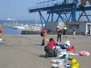 室蘭チャレンジ・アクアスロン2006に参加してきました。この日、今年一番の真夏日となり、暑くてランはバテバテ。 コースは港内を途中で右に折れ戻ってくる、750mを2周回の1.5km。波は全く無く、水温もまあまあということで、コンディションは最高。 ただし、中間のブイが一つずつでコースロープも無いため、ヘッドアップスイムができない選手はちょっと辛いかもしれない。 ランコースは、測量山公園折り返しで、ほとんどが坂道(アップダウンの連続)というハードな設定の12km、しかも砂利道が多かったため、上り下りとも走りづらかった。 AM8:10頃会場に到着、B&G海洋センターで受付をして8:30から競技説明会、9:30スタートと時間的には余裕の無いスケジュールだったかな。 しかし、まあ練習会という位置づけのため終始和やかな雰囲気で、ピリピリした感じは全くない。 ![]() 参加者33名とはいえ、名簿を見ると札幌のパッシュた3in1、エッジ、苫トラ、北大等の強豪メンバーがずらり。練習会とはいえ、その辺の連中はみな本気モード。 スイムは最前列に並びスタートダッシュで何とか先頭集団に入りながら着いていこうという作戦。 人数が少ないのでインコースを取る事にした。 秒読み開始3・2・1スタート! で横にいた森谷さんに付いて行こうとダッシュしたのですが予想以上に速く、どんどん離されてしまった。 これ以上ペースをあげると後が持たない、目標を他の選手に切り替えよう。 幸いすぐ近くに2〜3名?同じペースの選手がいたので、ペースを合わせ、付かず離れず間隔を取る。 コースロープが無いので、ヘッドアップでこまめにコーナーのブイを確認し、方向修正しながら泳ぐ。 最初のコーナーはほとんど込み合わない状態で楽々右折、しかしその次が問題。次のブイまで距離があるので、目標を確認しづらい、すぐ他に目標となるものを探した。 あった、 後ろにそびえ立つ風力発電の風車のちょっと右側がブイだ。風車の左に出ないように修正しながら泳ぐ。750mを2周回なので、以外に早く1周目を終え2周回目に突入。バトルも無いので足もそれほど使っていないし、体力的にも余裕あり。2周回目もコース蛇行せず良いペースです。 結局スイムでは6位の好位置で上がりランへ突入。 7月の鯵ヶ沢トライアスロンではソックスを履かずに走ったが、ランコースがほとんど坂道で、踵が靴擦れで血染めになってしまった。 今日もアップダウンの厳しいコースと聞いていたので、安全策を取りソックスを履くことにした。 小ぶりの洗濯カゴに入ったラン用品を身につけ、いざランへ! ランコースに入ると真夏日の暑い洗礼を受けた。「これは厳しくなりそう」 すぐ目の前に女子選手がいたが、ペースを上げすぐ抜いた。(すぐでもないか・・・) 1kmも行かないうちに上り坂が目の前に迫ってきた。 後ろから、一人また一人と速い選手が軽々と上って追い抜いていく。(身体が重ーい!あと3kg体重軽ければいいのに) なんせ苦手な上りの多いコースのため5〜6人ボロボロ抜かれました。最後は根性でチームエッジの一人を抜き返しましたが・・・。結局11位まで落ちました、トホホホ・・・。 うちのメンバーの記録は下記のとおりです。 総合記録 スイム ラン 前田紀幸1:19:36(11位)25:33(6位)54:03(12位) 成田実 1:26:00(15位)29:43(17位)56:17(17位) 棟方潔 1:26:11(16位)30:59(20位)55:12(15位) 森智希 1:32:38(22位)30:51(19位)1:01:47(23位) 多田明広1:48:07(30位)38:41(29位)1:09:26(28位) 北海道の新たなトライアスロンの1ページとなるべく、来年はみんなで室蘭トライアスロンに行きましょうね!! ![]() |