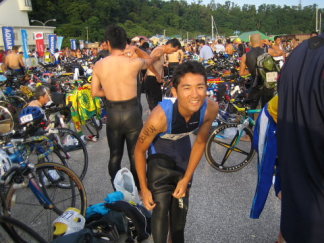 トライアスロンを始めた当初から、いつかは挑戦したいと思っていたロングディスタンス。 このオロロンは距離の上では一応国内最長距離。 地元北海道で開催されているということもあり、一度は出てみたかったレースだったが、今年で最後の大会だったので、トライアスロン暦わずか2年にして無謀にもチャレンジしてみることにした。 以下詳細レポート。 〜2日前から当日朝まで〜 ![]() 前々日。前々から一緒に行動させてもらえることになっていた函トラの皆さんにくっついて、スタートの増毛町へ向かう。気さくな方々で道中も楽しかった。3時ごろ到着。 受付を済まし、開会式、カーボパーティーに参加。 カーボパーティーで流されたVTRが意外と感動的で、テンションが上がる。おまけに不安まで助長される。 宿に戻ってミーティングをし、この日は特に何事もなく就寝。 前日。朝は散歩と軽いジョグ。朝食後、バイクの整備。10時から増毛港で試泳。棟方さんのゴーグルを紛失するという失態を犯す。 昼飯にカツ丼を食った後、バイクを依託し宿へ戻る。ここで初めてレース前にすね毛を剃ったが、ものすごい手間がかかる。こういうことはもっと前にやっておくべきである。 次の日が早いので9時には就寝。 当日朝。3時起き。4時に食事をとって、荷物をまとめて宿を後にする。 バイクに補給を積み込んだり、手荷物を預けたりしている間にすぐにスタート時刻が迫ってくる。 これから半日動き続けるんだなという不安に駆られつつ、スイムのスタートゲートをくぐるのであった。 〜SWIM〜 さほどテンションの上がらないままスタート。軽くバトルがあり、同じ人に2度もあごを蹴られる。 クラゲもウジャウジャいたが、刺されないことがわかっていたので、特に焦ることもなかった。 ここで体力 を消耗したくなかったので、キックもほとんど打たず、のらりくらりと泳ぐ。あまりコース取りは良くなかったが、ほぼ予想通りのタイムで上がることができた。