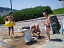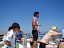 ![]() 函館湾内での遠泳体験教室に鯵ヶ沢トレーニングを兼ねて参加しました。 Bay Walk Community はこだての主催で初企画です。 8月になって、ようやく夏が来た!スカッと快晴、朝からジリジリして暑い。 もう十年以上も前になるかな、港祭りの企画で緑の島1周の遠泳があり、参加したことがある。 足に風船つけて集団でゆっくり泳ぐといったもので、距離も短いし、油臭くてあまり楽しくなかった記憶がある。 でも今回は船で西防波堤(通称赤堤)付近まで行って泳ぐので、なんか楽しそうで期待して参加しました。 参加人数は総勢15名、我がHTC(函トラ)から6名が参加した。 3班に分かれて船に乗り、現地まで約15分ほど。ちょっとしたクルージング気分を味わえた。 海から見る函館ドッ クの巨大クレーン、金森倉庫、シーポートプラザ等の景観はまた違った顔に見え、感動もの。防波堤に付いてその10m〜20m付近を堤防沿いに500m行って帰ってくる。折り返し地転にオレンジのブイが見える。 グループごとに伴泳者2名が付き。その人たちが先導する後を泳ぐ。 しかし、ついついレースモードになり先導者を追い越して泳いでしまった。 周りにヨットとシーカヤックがサポートととして付くので初心者でも安心して泳げる。 約1時間余りで全員完泳。とても楽しい遠泳だった。 |