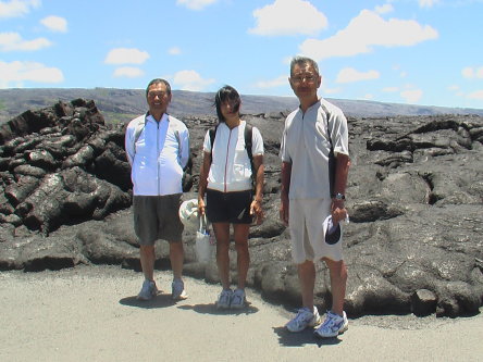 ![]() 溶岩が道路をふさいでいるところ、溶岩台地の雰囲気を見てください。まさにフライパンです。 右側は70〜74歳のカテゴリーで優勝した富田さん |