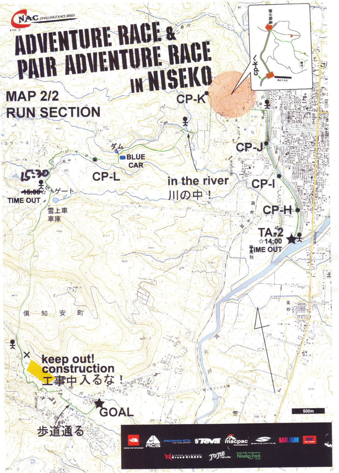 ヒロコです。バリバリ筋肉痛です^^; トレーニング不足&連日の睡眠不足で挑んで、スタート後、初っぱなのMTBの林道登りで、息も絶え絶え、仮死状態^^;でした。 「今日は絶対完走できない」と頭をよぎりました。心拍は180越え間違いなしです! ![]() そんなふがいない私を攻めるでなく、”ヒロコちょっと休め””ここで待ってろ!バイクはあげてやるから・・・!”という、みなさんの頼もしい優しい言葉につい甘え「そんじゃよろしく!!」と助けてもらいっぱなしのレースでした^^; さすがはしんちゃん!!準備万端!自前のロープに日頃鍛えたレスキューの技で、みごとバイク&ヒロコは救われたのでした。 でもあの辛い沢はのぼりは、コースアウトしてたんですね(-_-;) チェックポイントの1つ目を通過するのにこんなに時間がかかるとは・・・前回のアドベンチャーと比べて、今回は大変なの??と思っていたら、次からは、比較的順調に・・・逆にこんな簡単でいいの?と思うコース設定でした。 砂利の林道はタイヤをとられそうでおそるおそるだったけど、所々舗装路もあり、なんとか登った分を下り、あとは、平坦なコース!チェックポイントも確実に通過し(あまり迷うようなところもその後はなかったです)平地を飛ばし、復活!!何チームか抜かし、MTB のゴールへ 天気も良く、着替えもしないで、いざ!ラフティングへ 以前にMAEちゃんと乗ったダッキー(2人乗りボート)と違い、ラフティングボード(今回は4人ですが、6人くらいまで乗れます)は安定感があり、川の右岸・左岸の流れの違いや瀬や淵なども冷静に判断できた気がします。 自分的には、「立つ瀬がない」って、こういうことだよなぁ〜などと日本語のひだを感じつつ・・・ コースの中間地点あたりのチェックポイントで、左右のこぎを交代し、順調に何組かを超しつつ、うでとおしりが(ラフティングは結構おしりの筋肉を使います!)疲れた頃にゴール ![]() 川からあがると、布施Jrの最下位宣言チームが、前にいるではありませんか!! ”うちらって、かなり遅い!?”それは失礼すぎ〜(^-^)/ 補給をすませ、いざ得意分野のランへ!はじめは河川敷のコースで、NACお得意の橋の下のチェックポイントをいくつかとって、これまた簡単すぎ〜〜と思っていたら、スペシャルなときが私たちを待っていました・・・ 河川敷を終え、山に向かう。チェックポイントは、ジャンプ台!そうスキーのジャンプ台です。 コースを読みあぐんでいたところ、斥候杉さまが、「あっちにあった〜」と。ジャンプ台へ向かう階段を上りつつ、「ジャンプの選手はスキーを担ぎながらこんなところをのぼるのか!」「7500円払って私は何をしているんだ!」という思いを抱きながら、ようやく彼の地へ。 倶知安の市街地を満足して一望していたら・・・右方の道を登ってくる同士が・・・またしてもコースアウトしてたのね^^;急登したから近道だったよね〜ということで、自分を満足させ、次なるコースへ。 山頂から少し下ると分かれ道・・・どちらに行くか悩んでいたら、若者チームと合流する。似たようなペースですすみ、スキー場の登り口へ到着。 抜きつ抜かれつ・・・!”おばさん負けられません!”と奮起していたら、気がつけば、若者たちの姿はなく、またしてもコースアウト?? 「左に折れるはずだけど、どこにも目印がなかったよね〜〜」「こうなったら、山頂付近で正規のコースにもどるか!!」とあったけど、山頂付近から正規のルートに戻る沢は深すぎて・・・山頂付近でさまよっていた別のチームとともに戻ることを決断!!日も陰ってきて”遭難ってこんな感じ”とか思ってました^^; いざ下ってみるとあっさり、分かれ道に・・・NACのテープが・・・この目印を何故4人で見落としたぁ〜〜と嘆きつつ、コースにもどりました。 その後Jrのチームにまた遭遇!アドベンチャーならではのお楽しみを味わいました。 「もうまようところないよ!」というJrの言葉を支えにあとはニセコ比羅夫のスキー場を駆け足で下り、大満喫のレースでした! 追伸 足は笹で切った傷と、どこでぶつけたか記憶も定かでないアザでいっぱいです。 でもやっぱり楽しかった8時間です。また来年もでたいなぁ〜 |