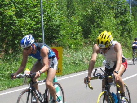 | 【SWIM編】 最前列には招待の有名選手が並んでいる。 アイアンマンジャパンで日本人2位になった益田大貴プロ、デュアスロン女子日本チャンピオンの斎藤愛里選手、昨年のこの大会の優勝者、吉越慎吾選手など、雑誌トライアスロンジャパンに良く出ている選手が間近にいる。 その並び、ほぼ最前列と言って良い位置にMAEさん、イーヅカ、布施Jrの函トラスイムお達者トリオが陣取っている。 自分は実力差も考えず、すぐその後ろに待機し、「速い人の後ろってポッカリ、スペースが空くかもね〜」っと、後で痛い目に遭うとも知らずに呑気に構えていた。 「パーン!」 普段見る空の色よりも濃い目の青にスタートの合図が響く。 泳ぎ始めて間もなく、濁っているため「前の人の足が見えないなぁ」と、思っていたらはじまりました。お約束のバトルです。 しかも、今までに経験の無いほどの・・・ 後ろに並んでいた速い選手がもの凄いスピードで自分の背中をほふく前進して行きます。 「コース幅そんなに狭くないだろう?」と、思うほど、人の背中をまるで通り道のように何人もが乗っかってきます。牽制するキックも役に立ちません。 「呼吸ができない」苦しくて顔を上げる。足が下がりスピードが落ち、また乗られる。沈む。 水中が濁っていて見えないので仕方ありませんが、トライアスリートは遠慮がありません(笑) スイムでは30分を切るのが目標でしたがタイム云々言っていられる状況では無くなりました。様々な後ろ向きな言葉が頭をよぎります。 いつでも休んで呼吸を整えられるように10mほど離れているコースロープにゆっくり近づいた。それが正解でした。 まだ込み合っているものの、先ほどのバトルから比べると可愛いものです。 とにかく呼吸を整えようと「ゆっくり、ゆっくり」と、自分に言い聞かせながら泳いだ。徐々に周りが見えるようになった。 斎藤君がいる。成田さんがいる。仲間が頑張っているのを見ると先ほどの後ろ向きな言葉が消えてしまうから不思議なものだ。 当日の湖面は風が強く、波があり、不意に大雪山のミネラルウォーターを補給させられたが、スイムコースの三角形の2辺を回る頃にようやく1500m泳ぎ切れる自信を持つことができた。 スイムアップしてから、遅れを取り戻そうとトランジッションまでの階段を「トリャ〜〜!」と、一段飛ばしで上ったら一気にバテタ・・・(ウマシカ馬鹿!) 【BIKE編】 いらないところで体力を使ってしまい、トランジッションはイメージ通りとはいかなかったが、以外にも残っているバイクの多さに驚いた。 今までのレースでは良くて中位だったが、今回は3分の2、いや4分の3が残っているようだった。一瞬、嬉しく思ったが、タイムを見ると良くも無いので冷静にバイクコースへと向かった。 このコースは高速コースのようなので、目標の1:15′に近づけるか楽しみだ。 また、周回コースなので、前後の函トラメンバーとの間合いが分かって面白い。 スイムお達者トリオはもちろん、成田さんやスイム急成長の斎藤君も前にいることだろう。 ランパートで絡み合いたいのでこのバイクパートで少しでも差を縮めておきたいところだ。 ゆるやかな上りやトンネルを超えると長い下りになった。DHポジションのまま曲り下る。 「ウォ〜〜 気持ちイィ〜〜〜!」 60km/hは優に越えている。下りから平坦になったが40km/hオーバーのまま折り返しに着いた。 あまり気持ち良くペダルを漕げたので前を行くメンバーを確認できなかった。 さぁ復 6月にSTIレバーのワイヤーに指を引っかけて前転落車してから、シフターをDHバーの先端に付けるバーエンドコントロールにしたのだが、アウターからインナーへの切り替えでよくチェーンを落としてしまうので、出来ることならアウターのまま登り切りたい。 折り返して間もなく、成田さんが来た。どうやらスイムでほんの少し先行できたようだ。登りに入ってから鎌田さんともすれ違う。 上りのキツソーなところでメーターに目をやると20台km/hだ。 ギヤも余っている。3周回目にペースダウンしてもアウターのまま行けそうだ。少しホっとして前を追う。 バイクパートでは、暑さはさほど気にならないが、1kmほどのトンネルは涼しくて気持ちが良い。 スタート側を折り返し、2周目に向かうと、ひとみさん、妻、リレーの部のスイムパートを終えた小杉さんが応援してくれている。ありがとう! 今度は慎重に間合いを把握したい。 折り返し1km手前で、イーヅカ、MAEさんらしき選手を発見!布施Jrはレースウェアを確認していなかったので、分からなかったがもっと前にいることだろう。 距離2kmタイム差にして4分弱だろうか? 次の周回に縮まっているのか、広がっているのかを確認したい。 2回目の登りでスイムでは5分以上離されていたと思う沢本さんに追いついた。 バイクを漕ぐ姿はきつそうだが、いつもの笑顔はさすがだ! 軽く声をかけ抜く。 2周目復路のトンネルで突然「ウェ〜〜〜〜〜」と、苦しむ大きな声が響