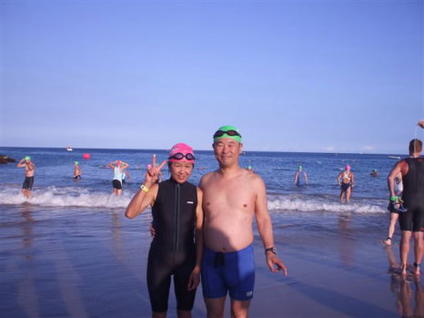 | ●今年のハワイは、肌寒く、10mくらいのコナウィンドが吹き荒れる風との戦いでした。 海も風のため波が荒く、1mくらいの逆向きの潮流もあり2km40分前後で泳げる見込みの調子であった私が、54分54秒かかりました。 マッキーのスイム練習に付き合っているので良く泳ぎこんでいます。 水に乗って軽快に泳ぎ、水がするすると体を滑る感じがあります。 しかし、底の砂を見るとゆっくりしか進まない。 そんな感じでマッキーは苦労しているだろうなと心配していました。 バイクはコナウィンドが吹き荒れ、スポークから唸り音が聞こえます。 ランは逆に涼しくて楽。私ふうさんの成績は、総合時間 8:08:34 997/1017位 年齢別42/46位 スイム54:54:00 tra 8:24 バイク3:53:53 tra 6:44 ラン3:04:39 (去年は総合 8時間18分3秒スイム 54分10秒 バイク 3時間45分44秒 ラン 3時間24分20秒でした。) 去年と比べて、スイムはほぼ同じ、バイクは8分遅い、ランは20分短縮。 スイムもバイクも去年よりはるかに悪条件だったので、大幅に改善したと、まあ練習は裏切らないと満足した次第です。 仕事でカンズメになっていた時、ビリーブートキャンプを続けていたので、腹筋と背筋が充実した。そのおかげ か、バイクでDHポジションが最後まで取れるようになったのです。あの風の中、去年とあまり変らないタイムでバイクを上がれたのは終始DHポジションを取ることが出来たためです。 ランでは、去年のように歩いているデブに抜かれるような事はなくなった。 いちおう、走っている感じを思い出しつつあります。 マッキーは荒波と逆潮のなか、押し戻されて前に進めなかったのではと思っていましたが、リタイアすることなく、最後まで泳ぎきりました。所要時間約1時間30分弱。 ただ制限時間1時間15分を越えたため、スイム終了で失格。先には進めませんでした。 最大の課題であったスイムの恐怖心を克服できたので大収穫。 1時間半も深い海の中にいたんですから大したものです。 去年の条件でなら楽勝であったと思います。去年はスイムでタイムオーバーなし。 1時間超えは3人ほど。今年はタイムオーバーがかなりいて、65人が1時間を越えました。 まあそういうわけで、本人はとても喜んでいますのでご心配なく。 同行はTomitaさんと、Naritaさん。 Naritaさんは気合が入っていて、かなりの好タイムでした。 息子さんの結婚式をオアフ島で挙げて、その後ハワイ島に移動しての参加でした。2週間を超える滞在。 羨ましい限りでした。 Tomitaさんは、スイムの位置取りを前にとりすぎ、バトルに巻き込まれ、出遅れ、またラントランジッションでミスがあり、惜しくも50秒遅れでハワイスロットを逃しました。バイクも、ランも文句なしの年齢別1位でした。 今年は世界選手権は30年記念大会らしくぜひとも出たいと執念を燃やしております。 ひょっとしてモナコあたりで再チャレンジするかも知れません。 〜フーさん〜 ●昨年は着いた日早々にホテルのプライベートビーチで足を切ってしまったので足だけは気をつけていたら今度は岩礁で手を切ってしまいました・・・相変わらずアホなタマです。 昨年すごく遠くにあると思っていた岩礁がすぐ近くにあったのでびっくり・・・ そこで2日間海あそびをして海亀さんや綺麗な魚たちと友達になりました。 ![]() それでやっと恐怖心がなくなり、当日は緊張しながらも後ろの方からスタートできました。 前に男性がいて、すぐ後ろを泳ぐと楽チンと聞いていたのでがんばってついていったら斜めの違う方向に泳いでいたらしく方向転換でだいぶロスしちゃいました。 それからは布施ジュニアに教えてもらったように、ヘッドアップを時々しながら沖にあるブイまで行き、そこから浜辺と平行に泳ぐも呼吸の度に水を飲むし、「ひえ〜〜〜っ!どうなってるの? これはもしかして波がすごいんじゃないのかな・・違うのかな・・ がんばって泳いでもあんまり進まないし・・・」って苦しみながらも「今回はとにかく完泳しなくちゃ!!」という思いで、頑張りました!! サーフボートの人たち、ジエットスキーの人たち、みなさんに応援してもらいながら何とか泳ぎきれて 本当にうれしかったです\(^o^)/ 今回は完泳できただけで大満足だったけど、来年こそは3度目の・・・で、完走したいです!!(*^ー^*)V 〜マッキー〜 ★函館組の成績一覧(スイム、バイク、ラン、総合時間、総合順位の順)★ Narita 50:45 3:15:11 2:03:56 6:20:33 538位 Tomita 1:02:22 3:28:37 2:21:56 7:07:43 816位 Makimoto 54:54 3:53:53 3:04:39 8:08:34 997位 2008 Preliminary Results |