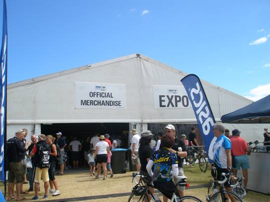 受付は今日までとのこと。 ホテル到着後、すぐに大会本部に向かう。 アイアンマンビレッジと標識があり、巨大なテントがいくつも建てられ本部になっていた。 まるで博覧会の会場のよう。 万博とまではいかなくても、20博くらいはありそう?