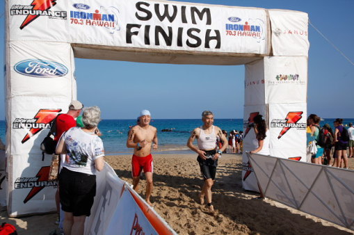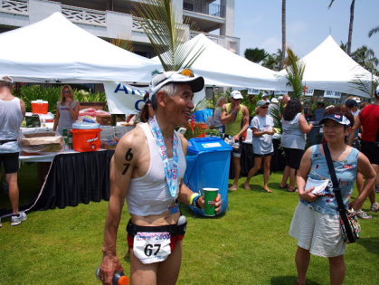| 今年のハワイは暑かったです。(昨年が異常に涼しかったんですね)。 でも、この暑さのお陰で、スイムスタート前はリラックスできました。(昨年はスイムの試泳で寒気がし、ガタガタ震えながらスタートを待っていました・・・かなり緊張もしていたのかも?) さて、いよいよスイムスタート! バトルもなし、ブイを確認しつつ、周りを見ながら泳ぐ。左右に人がいるので、ミスコースはしていないようだ。 ![]() 昨年のように、白波も立たず、海水浴気分で気持ちよく泳ぐ。 意気揚々とスイムゴール! ・・・ん?!・・・時計を見てガックリ! 51分もかかっているんでないの! でも、ものは考えよう、脚も攣らなかったし、スタミナもほとんど消耗してない。お楽しみはこれからだ。 例によって、ゆっくりとトランジットしてバイクへ。 遅れはとったが、焦りは禁物。 マウナラニまでの最初の折り返しは、体とバイクが折り合いをつけるつもりで軽くまわす。 折り返しを過ぎてペースアップ。 ハビィの登りが始まる。これだけスイムで遅れると抜き放題。 ハビィの折り返しの手前で、富田師匠に追いつく。が、しかし下りで物凄い勢いで抜き返される。 そのまま、100mぐらいの距離を保ってついていて気がついた・・・コナウインドが吹いてない! DHポジションをとる。ギヤをアウタートップにシフトする。コナウインドが吹かなければ、ただの下り坂、まわすだけだ。 昨年抜かれっ放しだった下りでごぼう抜き状態。 気持ちよくバイクフィニッシュ。 しかし、喜んではいられない、バイクラックはほとんどうめつくされている。 トイレで小用をしてランへ。 2〜3km走って、今回のコースがきついのがわかる。若干ペースを落とし、腕の振りで軽くリズムをきざむ。 ゴルフ場を出て、直線の折り返しに入る。ここでペースアップ。 この折り返しで先行する同じカテゴリーの選手を探す。2名の選手とは、200mぐらいだ。まず彼らを目標にする。 一段とペースアップ!体が意志に反応する。こんな状態は10数年ぶりだなぁ。 2人は抜いた! がしかし、ここで(大)の用事が・・・これで1分半ロス・・・○○○たれの面目躍如! 再びゴルフコースへ。 ここまできたら、脚が折れようが、心臓が飛び出そうがかまうものか! 思わず老骨に鞭打ってしまった。 渾身のロングスパートでゴール。なんとか6時間は切ったようだ。 表彰式。 富田師匠は、10月のチャンピオンシップのスロットをゲット! マッキーさんは5位! これで終わりだと思っていたら、自分の名前をコールされてびっくり! 本人もそうだが、わがチームの監督(嫁さんのことです)もまさかそういうことになってるとはつゆしらず、ダンナの晴れ舞台を見逃してしまいました。 年をとるとこんなマグレもあるんですね。 来年もみんなで行けたらいいですね。 今回の成績も皆さんの応援の後押しがあったからです。 ありがとうございました。 |