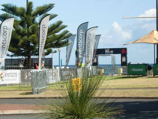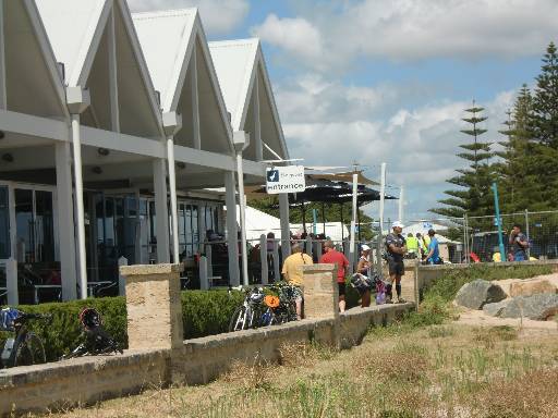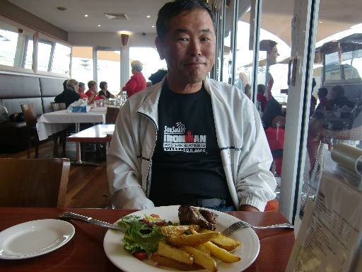 スイムコース。 ジェッティの周りを反時計回りに一周(去年は時計回り)。1周回の雄大なコース。 右顔あげの場合、往路で太陽が眼に入る。 ホテルからウェットスーツを着たまま歩いていける距離。 早朝の道路と砂浜はとても寒い。冷え性のマッキーは気分がへこむという。 しかし、海に入ると意外と水温は暖かかった。 1kmくらいためし泳ぎ。感触を確かめる。 ウェットスーツを着るとマッキーとあまり差がつかない。 マッキーのスイムも結構進歩したものだと思った。 2時間は切れるだろうと予想。本人は相変わらずタイムアウトを心配している。 朝はホテルの食事。 ベーコンエッグに、ソーセージに、豆。ジャガイモ。相変わらずのメニュー。 しかし去年より味が良くなっているように思えた。 オージー料理は、健康的なのか、とても味が薄い。 はっきり言って味が無い。 私自身、かなり薄味好みを自負しているがそれでも味が無いと思える。 ところが今年は少し塩味がするではないか。 日本人の味覚を研究したのか、去年より明らかにおいしかった。 変化がないのはつらいが、ともかく全部残さずに食べることが出来た。