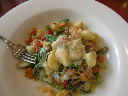 Gooseの中。おしゃれで素敵な店です 分厚いフィレステーキを食べる。35豪ドル。日本なら倍くらいしそう。 わたしは貧乏性なのか輸入牛が大好き。 放牧で動き回って、健康な牛のほうがすき。牛舎に閉じ込められて、動かないで飽食して、霜降りになった和牛なんて不健康。 硬い肉を噛み切る食感が大好き。柔らかい肉なんて、野性を損なうと正当化しています。 それでも今回はフィレですからそこそこに柔らかかったです。大満足。 パワーがみなぎってくる感じ。 マッキーはニョッキとかいう料理を頼む。ジャガイモと粉を練って団子状に揚げたものをチーズでくるんだようなもの。とても気に入った様子。