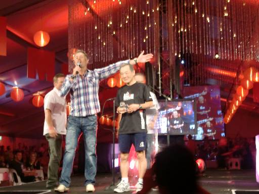 西口さん表彰台に登る。向かって左端 ワールドチャンピオンシップにも出たことがある人で、調子も悪くなくいい走りだったそうだ。 ハワイを狙ってきたと言い切っていた。 しかし、思いがけず大会のレベルが上がってしまった。 強豪が揃い踏みしてしまった。 表彰台に上がったことで少しにこやかになれて良かった。 M70の傾いた走りのおじさんもカテゴリ3位で表彰台に上がった。 最後に小島さんの表彰があった。 最大の拍手。 ステージを一周してお披露目。