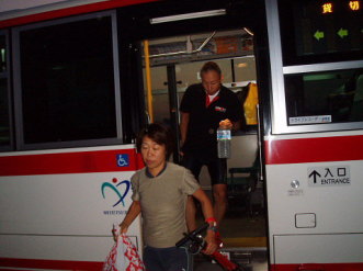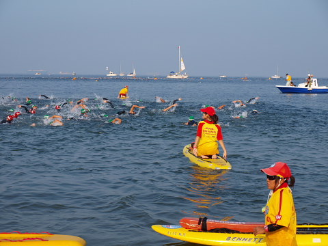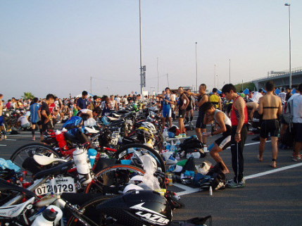 午前4時起床です!前夜寝たのは0時過ぎ。4時間弱の短めの睡眠でした。深〜い眠りから目を覚まします。 前回書き忘れましたが、JTBでの宿泊を手配した場合は大会当日の朝食サービスがあり、午前3時30分から食べることができます。 用意されていた食事は、おにぎりやパン、マカロニたっぷりのサラダや、ふかしイモなど(他にもなぜか冷しゃぶもありました)。 もちろんバイキングですので、好きなだけ食べられてとってもありがたいです。 食事の後、午前5時すぎ(一番早いバス)に、4人そろってホテル前からバスに乗りスタート地点の近くまで移動。(※応援者はあとでゆっくり無料シャトルバスで会場入りできます) バスを降りてからトランジッションエリアまでは少し距離があり、5分ちょっと歩くことになります。 ![]() トランジッションエリアに到着すると、まだ人はまばらな状態。 でもトランジッションエリア内にはバイクが整然と並べられており、これからレースが始まるぞ!という独特の空気感です。 海を見ると波はあまりありません。 スタート地点から海を見ると、左に空港へ続く大きな橋があります。ランの後半で渡る橋です。 ここで、「必ずこの橋を渡り切る!」と心に誓い深呼吸。一人で少しムードを演出してみました(笑) 自分のバイクのところに戻り、シューズやタオルなどをセッティング。 タイヤにも空気を入れます。今回のコースは路面が悪いことから、いつもより少し高めにしました。 【補足説明・・・前田】Nさんからのアドバイスだと悪路の場合はタイヤの空気圧は低めにセッティングしたほうが良いそうですまたボトルはエアロボトルを含めてトリプルで用意。 2つは水。残りの1つはエネルギージェル入りです。これにはザバスのピットインを4つ入れ、更に塩も入れ(3〜4g)、水を足しました。 したがって、結構、甘くてしょっぱい液体。 決して美味しくありません・・・。 でも練習中に色々試した結果、固形物が苦手な私は、この方法でエネルギーやミネラルを補給するのが適していると感じ用意しました。 今年は練習時も30℃を超える暑い日が多くありました。 100kmをバイクで走った場合には、私はトリプルボトルでも自宅に戻って体重を計ると2kg近く減少します。 脱水予防のために沢山の水を飲んでも低ナトリウム血症になる可能性もあるそうで、水分だけでなくミネラル補給も重要だと感じました。 軽いアップの後、更にエネルギーゼリーを1つと前日空港で買っておいたオハギを食べました。 ![]() そして更にここでも500ccくらいの約1%の食塩水を飲みます。これも暑さ対策で、練習で試し調子が良かったため実践しました。 その後、ウエットスーツを着て海へ。 海に入ると、北海道の冷たい水に慣れていることもあり、拍子抜けするくらいのぬるさです・・・。 大会側発表の水温は24.5℃でした。したがってスロットを目指している人でもウエットスーツは着用可です。 私はスロットなど全く関係がないですが、当然、ウエットスーツは着ますので、スイム中にそうとう汗をかくことを覚悟します。 試泳開始の時点で、試泳の残り時間はあと10分くらい。少し急いで最も沖にいる人のところまで泳ぎます。 泳いでみると水の透明度はあまり高くなく、比較的浅いところでも海底は全く見えません。 でも前を泳いでいる人の足は確認できました。 東川で前の人が全く見えない状態を経験していますので、足が見えるだけでも安心感があります。 泳いでみても、やはりコースは分かりにくい印象。 目印のためにヨットが停泊しており、ポールに吹き流しが付いていますが、吹き流しが凄く小さくて見えにくかったです。 やや不安も感じましたが、周りと一緒に泳げば良いと前向きに考えることに。 でもこれが後々甘かったと思い知るのですが・・・ 『スイム編』 今回は5グループに分けたウエーブでのスタート。 ![]() 第1ウエーブがエリートおよびエイジ34才以下、第2ウエーブがエイジ35−39才、第3ウエーブが40−44才、第4ウエーブが45-49才、第5ウエーブ50才以上です。 第1ウエーブが7時30分にスタート。その後、5分ごとにスタートとなります。 したがって38才の私は第2ウエーブで7時35分のスタートでした。 試泳を終えて陸にあがりスタートを待っているとMAEさんやヒロコさんが私を見つけて話しかけてきてくれました。 去年参加した長崎は、フローティングでのスタートでしたので、陸からのスタートはまた違った雰囲気です。 話をしながら、まったりと待つのも何か心地よい時間でした。 その後、ウエーブごとに纏められ、スタートを待っていましたが、隣の人が私にコースについて尋ねてきます。 自信がない中、私なりに「まずあのヨットを目指し、その横のブイを右で、その後は更に右に向かってあのヨットを目指すはず・・・」などと 説明。 その後、周りの人たちも加わり、それぞれの考えを話します。 でも皆、やや認識が違っているようで、やはり自信がない様子。 その中で「と