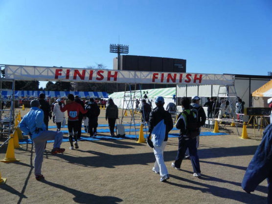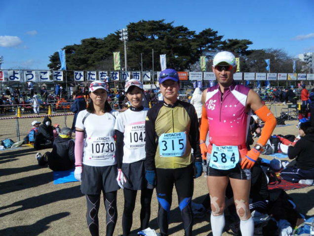 プロローグ![]() 2010 自身40代最後のシーズンは故障もなく順調にトレーニングが出来、5km、ハーフマラソン、51.5kmトライアスロンと自己ベストを更新することができた。 しかし、年齢的にもそろそろピークが近いことは覚悟している。 そこで、30度近い北海道マラソンを3:21’台で走れたのなら、涼しいところ(寒い)ではどのくらいのタイムで走り切れるのか?と、秋から冬にかけてのマラソン大会を探していた。 できればロード練習ができる秋のほうが良かったが妻の走力を考え関門が緩めのこの勝田全国マラソンを選んだ。 この大会に何度も参加しているK田夫妻が今回も参加すると聞いていたのも大きな選択理由のひとつだった。 飛行機や列車のチケット、宿の手配から荷物の預け場所など細かいことまでお世話になり、おかげで何ひとつ不安を感ずること無くレースに集中できた。感謝 <m(__)m> レース当日 当日の予想気温は最高5℃ さんざんウェアを迷ったがスタート近くになってから日が照ってきたので、結局夏用のウェアにアームウォーマーを付けただけにした。 道幅8Mほどの商店街道路を閉鎖したスタート地点に11,000名を超えるランナーが並んだ。最後尾は何百m後ろなのだろう? 競技登録しているので前方に並べたそうだが要項を良く読んでなかった。 フィニッシュ3時間レベルと書かれたプラカードの最前列から50mほど後方にK田先生と並んだ。 ![]() 11:00スタート 前が詰まっているためスタート地点を過ぎてもまだ歩きだ。(約50秒) 1kmを超える地点を右折し4車線道路に出るころになってようやく良いペースで走れるようになった。 この冬は雪が多く、ここ2カ月ほどペース走が出来なかったので早めにペース感覚を修正したい。 しばらく“km地点”標示を見つけられなかったので見逃したと思っていたら、“3.8km地点”と、中途半端な標示が目に入った。 “ん?”この大会は1kmごとの標示じゃないんだ。と、諦めた。 後は自分の感覚を信じるだけだ。 目標ペースはk/4’30 このペースで走り切れれば3:10分台だ。 自分としては目標だが、実際は実力とかけ離れた単なる“希望”なのかも知れない。 前方に自分と同じペースで走るランナーがいる。 長身で、どちらかというと後傾だが姿勢良く走っている。 上背の割にはピッチ走で足音も小さい。 彼に付いて行こう。 グッと顎を引き、腕の振りも小さく、顔が上下左右に振れることもなく、前を見据えている。とてもクールな印象。 前のランナーとの距離を着実に詰め、抜く。 抜くというよりも雰囲気は“仕留める”に近いかもしれない。 彼の事を“ハンター”と呼ぼう(笑) 5km 23’39 k/4’44ペース 最初の込み具合を考えればこのくらいかな? “6.8km地点”の標示を鋭角に左折すると15km地点を過ぎるまで8km以上 の直線だ。 片側2車線の建物の無い場所では左前方からの風が強くなったが、ハンターは機械のようにピッチを刻み、前のランナーを風よけにするでもなく右外側からひとりづつ、時にはパックごと“仕留める” 後ろからバタバタと、大きな足音をたてた地元の高校生らしき3人組がおしゃべりをしながら抜いて行った。 ハンターはこの後彼らがどのような結末をたどるのか分かっているのように次の獲物を見据えていた。 10km 21’54 k/4’23ペース まだ序盤なので元気な人も多いが最後まで持つのかは足音でだいたい分かる。 15kmを前に先ほどの高校生は大失速、笑顔も消えていた。 後半を考えて体力温存。 バイクで言うならばギアを2枚軽く 15km 22’14 k/4’27ペース 15kmを過ぎて左折すると向かい風が強くなった。 日が陰り風が冷たい。 さ、寒い! 汗をかいてもすぐ乾いてウェアも濡れていないようだが、帽子の下のバンダナが濡れて冷たくボーズ頭が割れるように痛い! 凍傷になりそうだ! 頭にホッカイロ貼りたい(笑) 気温が低いので水分補給は少なめにしていたが、最後まで持たないかもしれないので、一度トイレに行くことにした。 ハンターとは数百m離れたようだ。 20km 22’59 k/4’36ペース ハーフ地点を過ぎるころハンターに追いついた。 ハーフ通過タイム 1:35’44 ハンターの様子がおかしい。明らかにペースダウンしている。 フォームも呼吸も変わらないようなので自らペースを落としているようにも見える。 まだ頑張るべき時ではないが、このペースを保ちたい。 残念だがハンターとはここでお別れすることにした。 11,000名を超えるランナーの中には仮装を楽しみながらも速いランナーもいました。 本格的な忍者の格好をしたランナー。 刀まで脇に差して、頭巾から足元まで 良く見ると柄はミッフィーちゃん! 自作? (驚) 今話題のタイガーマスク マスクにマッスルTシャツ、レスラーパンツにタイツ。 本物のようでした。 後ろから見ると柄パンが裂け、リアルな尻がプリンと、出ている人もいました。 25km 22’33 k/4’30ペース 前半こそ気にならなかったが、参加人数の割に給水テーブルが短いので何度か紙コップを取り損ってしまったのだが、この勝田マラソンはと