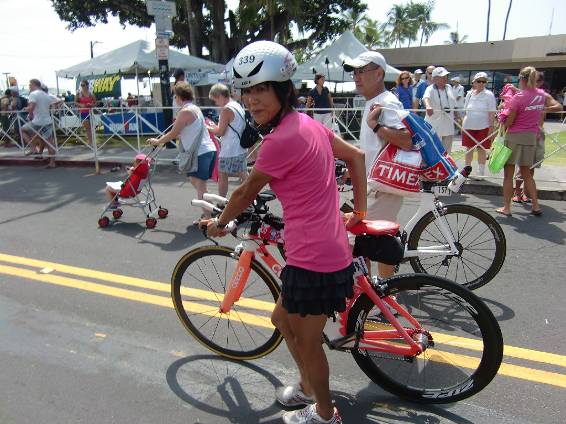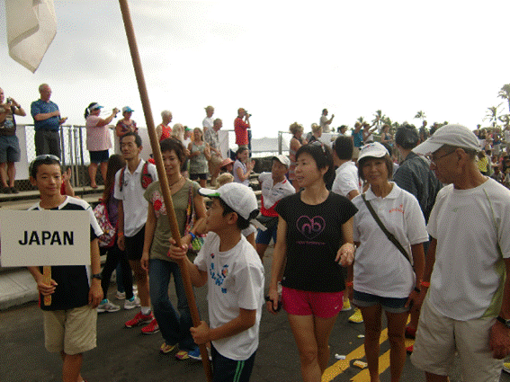 Akiさんです。海で会えればよかった。 ホテルはいつものシーサイドホテル。 会場と、街と、応援とすべてにアクセスがいちばん便利。 ちなみにキングカメハメハホテルが、レース会場・本部でビーチ側にある。 アリドライブという、海岸道路を挟んで、山側にシーサイドホテル。 レースが近づくとアリドライブは閉鎖されて、道路の横断がとても不便。 カメハメハホテルは街に出にくくなる。 早速バイクの組立に入る。 直行便がなくなったので到着が昼過ぎ。 あまり時間がない。 一応くみあがったところで、パレードに参加。 浴衣を着た人が一人、それとふうさんがちょんまげのかつらをかぶった。あとは平服。 日本人は総勢48名。パレード参加者は家族を含めてその半分くらい。少し少ない。