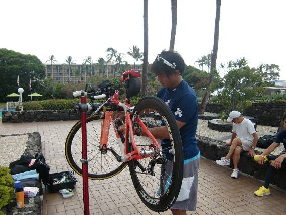 炭火焼の和食レストラン海想です。焼き鳥や焼き魚、和風ステーキなどとてもおいしい。 この日はカーボパーティがあったが 以前の経験からとても1食に値しない粗食だったのでパス。 しっかりと食事をとることを優先した。 マッキーは3回くらい海に行ってスイム練習をした。 10月12日金曜日 今日は、レース前日。 マッキーのスイム練習につきあう。 午後はバイク預託。 レースのバイクとランの預託バックを入念に点検してから 預託。