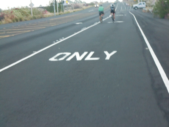 交差点を過ぎたら、左からの右折車がないことを確認して、路肩に移る。 明日の遠乗りに役立つだろう。 水泳の後、膝の痛みはほとんどなくなった。明日はハビ(ハワイ島北端の岬にある街)まで遠乗りをしよう。 夜は中華料理で決める。 コンビニで明日の朝食弁当を買う。明日は夜明けと同時に出発。ハビ迄、アイアンマンコースを走ってみよう。 10月11日(木曜日)。 今日はバイクコースの試走。 試合当日に備え、早寝早起きのリズムを作る。4時半ころ起きて、ゆっくりと腹ごしらえ。バイクの空気を入れたり、エイド食と飲み物の用意。パンク修理キットなどのツールも点検する。 7時夜明けとともに出発。アイアンマンのコースは10km足らずの東レッグと170kmの西北レッグがある。東レッグは省略して、アイアンマンの180kmへの距離あわせに、ハビより向こうに少しいってみるか、リゾートあたりで寄り道してみるか、その時の気分で決めることにする。帰りは16:00ころ、遅くて17:00頃と予告して出発。 薄暗い夜明けから、ハーバーあたりでようやく明るくなる。空港を通る頃、日が昇る。 一昨年引き返したフアラライリゾートあたりで日が照り始める。 広い路肩で、とても走りやすい。 ドライバーも親切で安心できる。 フアラライリゾートを越えて未知の領域に入る。 Causion Athlete In Training Bike yield road とか、バイクを保護する標識が頻繁に現れる。