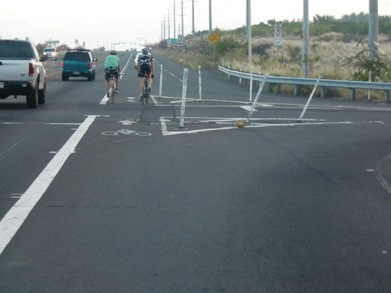 ONLYと書かれた車線は右折する車の専用レーンです。路肩を走り続けると、右折車と交差して危険。そのためバイクは折をみて、右折車線の左端に寄る。 あらかじめ左により、中央よりの自転車レーンにのる。交差点を越えたら、右折車がこないことを確認してから、路肩に戻る。最初は戸惑ったが、何とか馴れた。