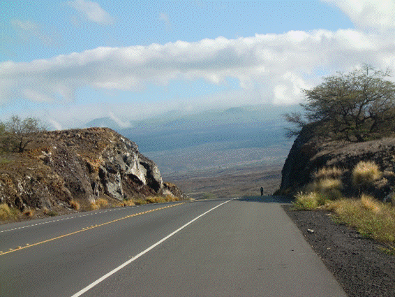 ワイメアに向かう道です。10マイルくらいの遠回りで帰れる。やってみるか?とんでもない。1000mを超えるアップヒルが待っている。人家が途切れさみしい何もないところ、パンクしたり、水がなくなったりしたら、のたれ死ぬかも知れない。運よく車が来て助けてもらったら、ゲイのおじさんだったりして、命の恩人という事で断りきれなくなったらどうしよう。ともかく、生半可な脚では行ってはいけません。 どうやら、ここらあたりが、アイアンマンの折り返しらしい。 もう少し行ってみる。 なにもなくなる。 もっと先に行けば何かあるのかもしれないが、ここで引き返す。 メータの走行距離は87km。 帰りにリゾートに寄って距離稼ぎをして 180kmにしようと考える。 帰りは、下り坂に加えて押し風で、楽勝。 元気いっぱい。 コナウインドは噂通りすごかった。 しかし、もう大丈夫。 下りは、風に飛ばされて落車しないよう 気をつけて、慎重に ペダルをこがなくても、風が運んでくれる。 軽く脚を回すと40km台。 脚を止めて30km台に落ちると 背中に風を感じる。 やがて左に大きく曲がる ここから下り坂 慎重に ここがよく落車をするという噂の場所。 左手東側の山が途切れるところ。 すごい横風が吹く。 一つ二つ下り坂を終える。 風向きが変わる。 なんと向かい風! 行きも向かい風だったじゃないか! 往復ビンタだ。 下り坂なのに、時速20kmでないところがある。 我慢してハビの坂を下り、登り口に戻る。 カワイハエの街だ。 そこでコンビニによる。
