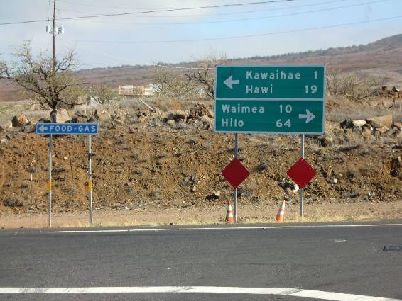 もうすぐ分かれ道。クイーンK(19号)が終わり、ハビ行き(270号)とワイメア行き(19号)の標識。 ハビまであと19マイルとの標識。
