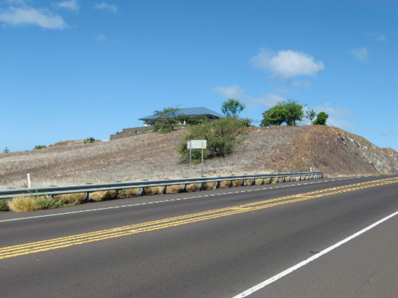 溶岩のゲート。クイーンKはもうすぐ終わる。帰りはあと50kmという目安。ハビの難所から、帰ってきたという気になる場所。 ここは冨田さんが、帰ってきたと感じるゲートだと話していたやつだ。 影が長くひんやりとして気持ちがよい。 まだ朝早いからだ。 レースの時は、太陽が真上から逃げ場なく、容赦なく照りつけるのだろう。 クイーンK(19号)が終わり、ハビ行き(270号)とワイメア行き(19号)の分かれ道に到着。カワイハエという所。