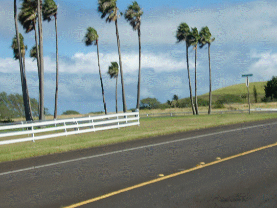やしの木が根元から大きく揺れている。すごい風。コナウィンドです。 椰子の木が幹から揺れている。 ゴーッとうなりをあげるすごい風。 バイクをヨットのように、風上に傾けバランスをとる バイクから降りてデジカメで動画モードにして 椰子の木が揺れている様を撮影してみる。 脚を開いてしっかりと大地を踏みしめて撮る。 油断すると体が揺さぶられ飛ばされそうになる。 立っているだけでも大変。 しかし、この風でよくバイクのバランスをとって乗れているものだと自ら感心する。 北から東へ向かって緩やかに湾曲する道路を登るうちに、横風からモロの向かい風に変わっていく。 時速10kmを保てないほど。 だんだんときつくなるが、もうすぐ坂の頂点だ。 やがて右の緩い大きなカーブが終わり東向きの直線道路になる。 ハビの街に到着した。 家と、教会、学校、寺、そして店が少しばかり並ぶ。 西部劇の街並みのよう。