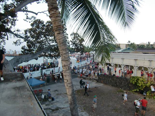 店の屋根の上から。人垣の頭越しに、スイム会場の海が見えます。 スイムスタートまで居させてもらった。 スタートしてしばらくしてから。 「警察を呼ぶぞ、逮捕されるぞ」。 と注意を受ける。 みな雲の子を散らすように退散。