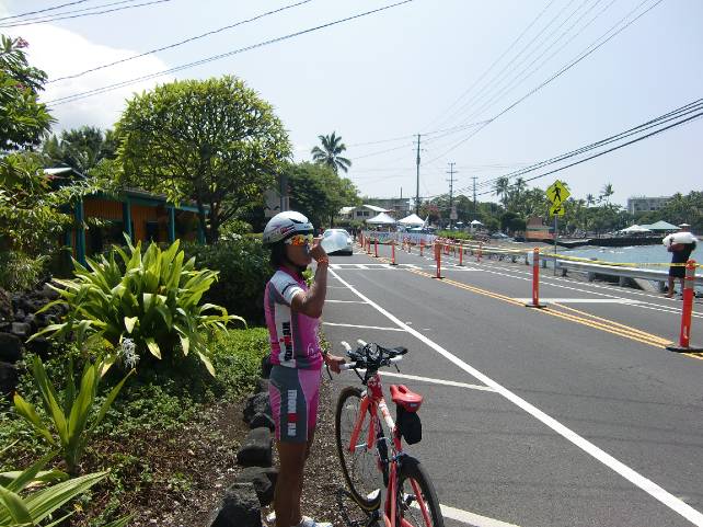 右に空港へのアプローチ、やしの木の並木が見える。 空港が近づき、椰子の木の並木道が遠くに見えてきた。 空港の管制塔も見える。 風向きが変わってきた。 30km近くでる。 へろへろに疲れて遅くなったのではなく、 向かい風のせいであった事をあらためて確認した。 空港をすぎる。 あと10km。 ハーバーをすぎる。 あと5km。 コナの街に戻る。 帰ってきた。 アイアンマンのコースを試走できた。 折り返しではこんなものか、楽勝と思ったが、 復路で思い知らされた。 只では済まない難コースという噂を、 しみじみとほんとにそうだと実感した。 16時30分。 実走9時間と少し。 休憩と写真撮影の停止時間を加えて11時間30分。 膝は痛くない。 朝は稲荷寿司4個。 走行中はソイジョイ1個。 ようかん1個。 スイカ。トマト。コーラシェーク。 水1。緑茶2。コーラ1。オレンジジュース1。レモンティ1。以上。 かなり粗食で通した。夜はしっかりと海想で和風ステーキを平らげる。