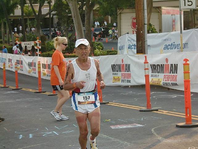 クアキニ通りを駆け抜ける冨田さん。あと1マイル。力強い走り。 元気いっぱい。 後はカウントダウンを観る。 23時59分10秒くらいに77歳の女性がゴール。 大歓声のうちにカウントダウンが終わった。 ハワイアン戦士の火の踊りを観ながら三々五々 ホテルに帰っていった。 10月14日日曜 ネットで冨田さんの成績を確認。 日本では稲田さんがM80+カテゴリで優勝。 反省をかねて朝食後スイム1km。 次の西オーストラリアへの始動だ。 昼前にもう一度泳ぐ。 昼はハーバーまで往復10km。 冨田さんと3人でサイクリング。 トローリングのクルーザーやヨットなどが停泊する リッチな世界。 そこのレストランに入る キンキンに冷えたビールを肉厚の金魚鉢のようなグラスで一気にやる つまみはポキ。