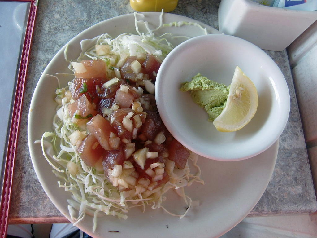 ハーバーでのランチ。ポキ。カツオのぶっちぎりを醤油付けにして、マッキーネギでまぶし、キャベツに浮かせたもの。絶品でした。