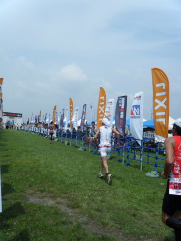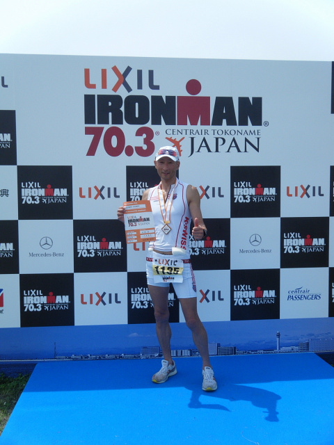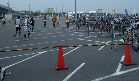 相変わらずレース前夜は眠れない。 トランジットのイメージを繰り返しているうちに、寝付くタイミングを失ってしまった。 IRONMAN70.3JAPANという、ビッグなレースではあるが、全国のトライアスロン仲間との「トレーニング成果発表会」的に考えているので緊張感はない。筈。 コナやラスベガスのスロットなどを考えるレベルではない。 朝方、うつらうつらと一時間ほど眠れただろうか? エイジ7位 ロールダウンでラスベガスGET!の、夢を見た(笑) 4:00 起床 ある程度身支度を整えてから、ホテルの朝食会場へ 選手のあまりに旺盛な食欲は想定外(笑)なのか、おにぎり類が間に合わない。 軽く、パンとバナナを食べ部屋に戻り、もしかしたら…と、用意しておいたコンビニ食でエネルギー充填 完了! 5:30 チーム仲間と会場へ バイクの再点検、補給類のセット、トランジットバッグのセッティングやナンバリングを終え、早めにスイム会場へ。 徒歩で30分近くかかった… Swim 1.9km プロカテゴリーのスタートは7:30 ウェーブは10分間隔でスタートする。 S藤さんは第4ウェーブ。Iちゃんは第5、自分が第6、I岡さん、Fうさん、A浜さんが第7、MッキーとH子ちゃんが第8ウェーブだ。 今回のレースには安田大サーカスの団長も出場していた。 バイク好きは有名ではあるが、トライアスロンをやっているとは知らなかった。 カメラマンや音声さんなどのスタッフも一緒なので、番組にもなるのだろう。 カメラに向かって、「ほなイッテくるで〜!」と、テンション高ッ! 前のウェーブがスタートしてから100mほど沖のスタートエリアまで泳ぐ。 水温は23℃ほどで、適温と言ってよいだろう。 ただ、前の人の足がようやく見えるくらいの透明度しかない。 フローティングのまま待機していると追い潮のため流された。 スイムが苦手な自分には追い風ともいえる。 スタートリストでは169名だったが、ずいぶんバラケているように見えたので、最前列で待機する。 「プァ〜!」と、エアホーンが鳴りスタート。 「さぁ 楽しもう!」 ウェーブスタートって良いですねぇ バトルは殆ど無し、時折足を触られる程度。 すぐに自分のペースで泳ぐことができた。 キックは殆ど打たない。バランスを取るだけ。 触られたときにけん制するくらいだ。 トランジットも距離が長いし、何よりバイクに脚を残したい。 進行方向の大きなブイを見つけるためヘッドアップして今更ながら気が付いた。 同カテゴリーのスイムキャップがブイと全く同じ黄色だった。 ブイ間は3〜400mあり、一度ではなかなか見つけられない。 途中、自分を追い抜く選手。 フォームも綺麗で自分より泳力が上なのはあきらかだ。 ピタリ後ろにつくと付いていけそうだった。 しかし、ヘッドアップするごとに少しずつ離れていく。 「彼を信用して付いていけは良かったかな?」 次回のレースに生かそう! ほぼ3回に一度ヘッドアップしたので大きな蛇行はなかったと思う。 スイムフィニッシュのアーチ型バルーンが見えたときはホッとした。 スイムアップして時計を見て驚いた。 「29分台?」追い潮でワンウェイなので、タイムが良くなるとは思ってはいたが、ここまでとは思わなかった。 時計が止まっていないか確認したくらいだ。 ゴーグル、キャップ、上ウェットを脱ぎながらT1バッグを取りに走る。 バッグには大きな花を付けておいた。「おぉ 目立っている」 バッグをピックアップして更衣室へ スムーズにセット完了! 寝付けないくらいくり返したイメージ通り!(笑) バイクまで300m以上?走る、走る。走れる。スイム後の身体の重さを感じない。 市民プールで、スイムとプールサイドランのメニューを繰り返した成果かな? バイクの前でシューズを履き、乗車位置まで。 本来ならば、バイクにシューズをセットしたかったが、今回は不可だった。 スイム 29:07 T1 4:00 ![]() バイクコースの序盤は海岸沿いで平坦だが、狭くてトリッキーだ。 防波堤のような所を多く通る。 継ぎ目や段差が多く、その都度、脚を止め、腰を上げ、リム打ちパンクには気を付けた。 軒下をかすめるような狭い道を過ぎ15km地点で一般道へ出た。 「これでようやく給水、補給ができる」 給水はポカリスェット、BCAA,クエン酸、塩少々の混合1.5リットル。 補給食は、クリフバー2 ザバスピットイン3 20kmを過ぎた辺り、前ウェーブでスタートしたIちゃんに追いついた。 「Sさん、10番手位!」 「エェ〜 そんなに上位なの?」 バイクでは何十人もパスしていないし、スイムでそれほど上位とは考えられないので、トランジットが良かったのかな? 平坦な所で、後ろから「グゥオー!」と、同カテゴリーの選手たちにパスされた。 自分のスピード表示でも42,3km/h出ている。 アッという間に見えなくなった。「これがハワイに行く人達のスピードなんだな」と、間近に見れて嬉しくも思った。 コースは内陸部に入ると、小さなアップダウンの連続だった。 狭いクランクカーブの右左折、下ってスピードが出たところを減速し、Uターンして登