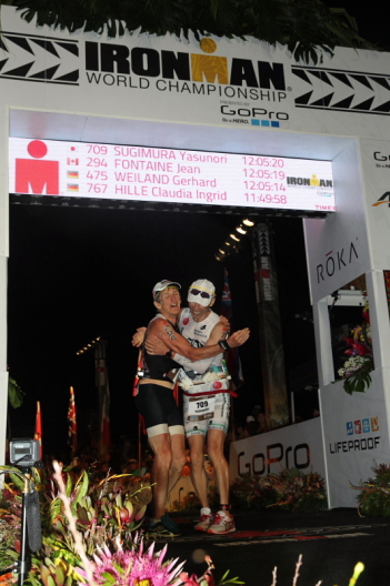 2015年10月10日 IRONMAN World Championship・Hawaii 今回が37回目を数えるこの大会。 今年は40の予選レースを7万人とも10万人とも言われる出場者の中、スロットを手にしたおよそ2300名の選手が、男子プロ、女子プロ、各エイジチャンピオンを目指し聖地ハワイ島コナに集結した。 Prologue 2006年 当時、日本最長と言われた日本海国際オロロントライアスロンのラストレースで無謀にもトライアスロンデビューした。 脱水の為、ヘロヘロでのゴールだった。 点滴してもらおうとヨロヨロと救護室へ向かう途中、 リレーの部で出ていたアダムと目が合った。 「お元気ですか?」 いつものセリフだ。 杉村 心の声 「元気じゃねーよ!」 (By 近藤春菜 ) 点滴が足りず羽幌町の病院まで救急車デビューまでしてしまった。 あれから10年。 IRONMAN World Championship 憧れのハワイ島・コナのビーチでスタートを待つ自分がいる。 アイアンマン・ハワイは自分の夢であり憧れであったが、決して目標では無かった。 なぜなら、同年代のハワイ常連選手の実力やトレーニングの量や内容を知るにつれ、軽く「IRONMAN World Championshipが目標です」とは言えなかった。 あまりにも高い壁だった。 ![]() 昨年のアイアンマン・ジャパン・北海道でマグレとマグレが重なった大マグレでスロットを獲得することができた。 逃した選手とは11時間弱のレースで僅かに1分30秒差だった。 レース直前、ある方からアドバイスを受け、シフトを電動化した。 それまではDHバーの先端に付けていたバーエンドコントロールなので、元来めんどくさがりの自分はあまりシフトチェンジしない方だったが、スムーズ&頻繁にシフトチェンジできるようになり、結果ランにも脚が残せた。 また、3週間前のショートのレースで、自分の確認不足でスイムアップの時、すでにタイヤがペチャンコになっていたこともあり、今回はそれを教訓に、スイムからランフィニッシュまで何度もイメージし、細かいことにもWチェックを徹底した。 すべてが良い方向に流れていった末の1分30秒先着だった気がする。 今後の人生でもう、ラッキーなことは残っていないかもしれない。 Swim スタート10分前、入水してゆっくりスタートラインへ。 最前列から10mほど後方へ位置取り、立ち泳ぎで待機する。 ルール上、ウェットスーツ禁止だが、海水の為、両手でのスカーリングやカエルのようなキックだけでも浮くことができた。 ![]() AM 6:55 文字通り号砲一発で男子エイジ一斉スタート 後方からのスタートなのと、先は長いのでショートのレースの様にダッシュしている選手は周囲にはほとんどいない。 多少バトルはあったが、200mほど行くとだいぶバラケタようだ。と、言うよりも、お互いマイナスになるので争わないという感じかな? 同じくらいのスピードの選手とパックで進む。 ヘッドアップもせず、コースもお任せで (^^ゞ 沖に行くにつれて右からのうねりが強くなり、呼吸のタイミングが悪い時、何度か ひっくり返りそうになった。 1600m地点に停泊している船を右に曲がる。ここで腕時計を見ると31分台だった。 自分としてはマズマズのタイムだったが、良かったのはここまでだった。 2、300m進み、さらに右に曲がり陸を目指す。 しばらくして今まで一緒に泳いでいたふたりがコースブイよりもずいぶん左にコースを取った。 スイムゴールのカイルア・コナ桟橋には7~8mもあるドリンク型のバルーンがあり遠くからでも何とか見えるのだが、この辺りはうねりも高く、周りも見えずらかったのでブイを見失ったと思い、仕方なく単独になった。(これが結果的に失敗だった) ![]() 知らず知らずのうちに流されて最短コースに入っていたのだろう。 15分遅れてスタートした女子エイジのトップグループが物凄い勢いで来た。 10人か20人かわからないが、たぶん、3800mを1時間切るくらいの“群れ”だ。 我がチーム内で例えれば、日下部コーチの“群れ”だ その日下部コーチの“群れ”に、 そう、襲われたという表現が一番近い。 頭から背中から全身はたかれ、モミクチャになった。 「あんた、ここにいるんじゃないわよ!」そんな声が聞こえてきそうだった。 今まで、平穏に「おぉ 海底にカメラマンがいるなぁ」とか、多少うねりがあって泳ぎずらいけれど泳ぎ切る自信もあったが、一気に余裕がなくなった。 ウェットスーツなしのバトルは厳しく、命からがら左にエスケープした。 その後も、またいつの間にか流され、1時間一桁の選手であろう、我がチームで例えれば、スイムお達者クラブの、飯塚、布施Jr,MAEさんの“群れ”に襲われた。 イワシの気持ちが少し分かった。 もうね。 スイムの速い人は嫌いです! ワールドチャンピオンシップの洗礼を受け、ヘロヘロでスイムアップ 3.8km 1:32:16 Bike およそ2,300台のバイクラックから自分のバイクを迷わず見つけられるのか心配していたが、まばらにしか無かったので危惧することはなかった。 (;一_一) バイクのメインコースはクイーンKハイウェイを北進してハワイ島の北端