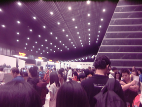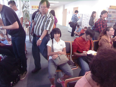 日本人はほとんどいない。おそらく我々一行だけではないか? 荷物を預ける。 バイクケースを預け超過料金なしで無事通過。 パンパンに膨らんで7kgちょうどになっているリュックを担いで荷物のチェックイン。 リチウム電池の安全証明書を握りしめていたが、あっさりと通過。 出国手続きをして、出発ロビーへ。 中国語が飛び交うが、なぜか聞き取れない。チーがツー。ディアールがディエン。 まどなど、標準語なのだが南方訛りがある。 現地でつたない中国語が通じるかどうか聞き取れるかどうか不安になるが、なるようになるでしょう。 ほとんど台湾の人たちばかり。 台風の影響で飛行機が遅れて2時間ほどよけいに待って出発。 時間ぎりぎりを攻めれば当日に澎湖(Penghuポンフー)に渡れるかも。 という計画も立てていたが、なにが起こるか解らないのが海外旅行。 無理をせず、台北に一泊して翌朝澎湖にわたるよう手配していた。 正解。 台北の桃園空港に到着。ここは日本でいえば成田空港に相当。