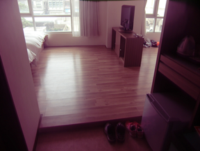 1840という系統のバスに乗って 、終点松山空港の一つ手前の停留所で降りて、 ホテルまで徒歩460m。 GoogleEarthで予習したとおりの景色。 バイクケースにリュックを乗せて、ゴロゴロと転がしながら移動。 ちゃんとホテルに着けました。 近くのレストラン街も下調べしていたもののもう夜も遅い。 コンビニがすぐそばにあり、そこで夜食を買い込んで、その日はお休み。 翌日のタクシーの予約とモーニングコールをフロントに頼んでおく。 英語が少し分かる人で、お互い少しずつの英語と中国語両方を使ってなんとか確実に予約完了。