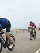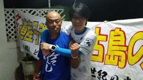 | 【はじめに】 今回で5回目の挑戦になりました。回数を重ねる毎に、慣れもあるのか緊張感、そしてワクワク感が薄れてきてしまっているのも事実かもしれません。 そろそろ一休みしようかなあとも思うようになってきていました。そのためか、特に宮古島のための練習はしていません。 健康維持のために毎朝出勤前に三本ローラーもしくはトレッドミルを行うのみで、土日も平日と同じような感じで、仕事、家庭に影響がでないように負荷もほどほどに、時間もかけないように、早朝練習のみを継続しました。あまり一生懸命練習していないので幸いに、練習がつらいこともなく、怪我も一切ありませんでした。 一番いかれた練習は、出張続きで、天気も荒れて、ホテルの部屋の中で一時間テレビを見ながら、ひたすら足踏みランをしたことでしょうか。 日々の生活に忙殺されながらも、特に頑張ることもなく健康のために練習だけは継続していたので、とりあえず完走はできそうかなといった感じで宮古島入りしました。 【レース前】 ![]() 南の島の天気は変わりやすく、天気予報はほとんど当たらないので、あまり気にしないでいましたが、4月15日の宮古島入りした日は肌寒くさすがにちょっと不安になりました。 この日は昼頃について、バイクの組み立てを行い、ワイドーパーティに向かいます。エキスポでレースに使うonのシューズやスポーツ羊羹と、マグオンのジェルを少し買って補給食としました。 そして恒例の“道産子会”に稲岡先生と一緒に参加し北海道からの参加者との交流を楽しみ一日目は終了になりました。 いつもハゲしく競う羅臼の横前さんと一緒に レースの前日は、いい天気でした。そういえば昨年も前日はいい天気で翌日に嵐。今回もそんな感じでしたが、せっかく宮古島に来たので、試泳だけでもと思って、きれいな海で泳ぎました。なんとも気持ちのいい海でした。 午後からは、妻がレンタカーで観光したいとのことで、伊良部大橋を渡って、伊良部島を回り、下地島というところまで行って来ました。 伊良部大橋というのは、コースではとてつもない鬼門で、風も強いし、アップダウンもあり昨年も風で冷や汗をかいた思い出のある場所です。 さらに噂ではその橋のつなぎ目の部分が滑りやすいとのことだったので確認もしました。 宮古島はレース前日に余裕があるので、この一日が一番楽しいひと時です。そんな一日もあっという間に終わり夜8時過ぎには布団に入りました。 【レース当日】 いよいよレースです。 4月17日朝は4時30分に起きて、ホテルでサンドイッチを作ってもらってスタート地点である東急リゾートに向かいました。 前日まで嵐になるという噂もあったのですが予想外に意外と落ち着いた天気で今年はスイムできそうだなといった感じでした。 スイム練習はあまりしていなかったので一時間ぐらいでゆっくり泳ぎきれればいいかなといった感じで臨みました。 【スイム】 レスリングの吉田選手の合図で一斉スタートです。 さすがにバトルはすごいですが、あまり一生懸命に泳ごうとはしないでいると意外と気にならないものです。 ガツガツ泳いでいる人が来たら道を譲って安全第一で巡行しました。 バタ足をほとんどしていないので足をつかまれることが多かったように思えます。 触れたり当たったりするぐらいならいいですが、やはりいかなる理由でもつかんで上に乗るのはいけないと思いました。 あまりにもひどい方もいたのでその場合は、バタ足をして振り切りました。足は推進力のためというよりは足をつかまれないようにするための防御手段になるなあと思いながら、時々魚も見えて、のんびりマイペースで泳ぎました。 スイムアップはほとんど予定通りでした。 少しシャワーを浴びてトランジットに向かいました。そうしたらスコールのような大雨になり風も強くなってきました。 【バイク】 今日は安全運転で行こうと、心に決めて、あまり焦らないでゆっくり走行しました。 スコールの中、鬼門の伊良部大橋も無事渡り切り、さらに直角カーブのある伊良部島内も走り切り、雨も上がって来ました。 あとは伊良部大橋を渡って宮古島に戻れば鬼門もクリアです。 安全運転を心がけて車間距離もとって、橋の上まで登って行って、橋のつなぎ目に差し掛かりました。 ここは注意だなと思いながらつなぎ目を越そうとした時です。 一瞬ですが、自転車がすべって真横になりました。まさかと思いました。転ぶわけないよな、意外と何とか持ち直すかなとか思いました・・・ダメでした。 濡れた路面でウオータースライダーのように、すごい勢いで滑っていきました。 これってやばいと思いましたが、どうすることもできずそのまま空を見ながら滑り続けて止まりました。 幸いに路肩付近で止まり、前後のバイクとも車間がとってあったので、単独事故で済みました。 ほんとうにほかの選手を巻き込まなくてよかったです。 今まで練習でも、レースで