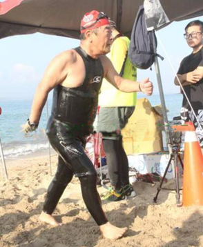 スイムスタートを待つ、杉さん、奈良さん、シンちゃん。 容赦なく快晴の空。 湿度高く空気は重くじっとりと湿った感じ。 予報では34度、湿度87%、体感温度47度。 と伝えていた。 水温は24.3度でウェットスーツOKと昨日決定されていた。 プロが男女別に時間差でスタート。 一般参加エージグループの選手たちは大まかに、自主的にスイムが早い順に並ぶ。 1時間10分以内、1時間10分~41分、1時間41分以上。 と三つにグループ分けするプラカードを持ったボランティアが並ぶ。 タマ(槇本美恵子、マッキー)も真ん中のグループ一番後ろに並ぶ。 私も真ん中のグループ後半に並ぶ。 タマは相性の良い師匠の個人レッスンに巡り合えた。 そのおかげで長年のスイム伸び悩みから脱して、ようやく泳ぎが一皮むけてきつつあるところ。 私の9割くらいのスピードになってきた。 去年は後ろのほうに並び、平泳ぎに囲まれてひどい目にあったので、今年は背伸びしてもう少し前に並んだ。 昨日の試泳の時は、強い西風に伴う潮流があったが、今は朝凪。ほとんど無風で潮流もなさそう。 スタートホーンが鳴る。 8人ずつ3~5秒間隔でウェーブスタート。 スタート直後にセンサーワイアが貼ってあり、 そこを通過した時点で個人ごとのタイマーが始動する。 制限時間もすべてここから個人ごとに始動。焦らなくてもよい。 マラソン大会では遅い人ほど後ろに並ばされ、制限時間や関門はスタートロスタイムと無関係に号砲から。 これは制限時間が気になる遅い人にはとてつもないプレッシャー。 殺気立って前に行こうとする。将棋倒しの事故が起きかねない。 陸連も何とか固い頭を改めてほしいものです。 などと考えているうちに自分の順番が来た。 砂浜を30m位走って入水。波は少ない。 腰まで歩いたら泳ぎ始める。 台風の後だった昨年とは違い、水は透明。きれいな砂浜。 魚は見えない。貝やカニの巣穴らしきものが時々見える。 気分よく泳ぐ。丘の上は湿熱地獄だが、水の中は気持ちよい。 日の出だ。 左顔挙で目に入りまぶしい。右顔挙げに代える。 こちら側はあまりなれていないので蛇行気味。 ヘッドアップを頻回にして方向を確認。 ウェーブスタートながら、周りには人がいっぱい。 ゴーグルの上を叩かれる。ゴーグルの位置が微妙にずれるも、何度か瞬きや口を開け閉め顔の筋肉を動かすと 蛇行して人にぶつからない様、注意を払って泳ぐ。 ぶつかったりしたら何をされるかわからない。 今年はバイクショーツだけを中に履いて、袖なしのウェットスーツ。 涼しくて腕がよく回る。 猛暑の時は袖つきウェットスーツは暑くてたまらない。 気分よく泳ぐ。 1周回目、丘に上がるとケコちゃんが応援してくれる。元気をもらい2周回へ。 相変わらず周りに人が絶えない。折り合いをつけつつ慎重に泳ぐ。 ドラフティングターゲットを探すが、どうも安定した泳ぎ手が見つからない。 潮流があるのか、沖のブイが岸よりに流され、岸側の最終コーナーブイと沖側の折り返しブイとが紛らわしい。 危うく最終コーナーブイに向かうところだった。 立ち泳ぎで折り返しブイがまだ遠くにあることを確認正しいコースを泳ぐことができた。それ以外は気分よく泳げた。 泳ぎ終え丘に上がる。