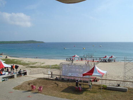 ◆スイム編◆ 澎湖Shili?裡ビーチ まだ薄暗い。 チェックインとトランジッションのセットアップが終わりビーチに向かう頃にはようやく東の空が白み始めた。