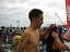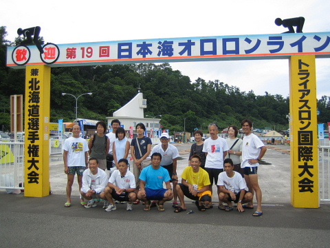 あれは2月だっただろうか?かみんぐ(上磯町営のプール)で、ターンをした瞬間”リレーのスイムなら!”とひらめいた。2005年になり、オロロン参加表明者が続々・・・オロロンの1週間後に開催されるアイアンマンコリアに参戦を決めていた私は、ひどく寂しい気持ちだった。そんなときにひらめいたのである。私の申し出は、快く受け入れてもらい、2年間オロロンをサポートしてくれたバイクのイシヤンとマラソンを始めて以来目標としているランのマッキーさんとのチームMaidoが結成された。 私としては5回目となるオロロン。初めて土曜日出発で、早朝3:00に函館を出る。 スイムだけで、荷物も軽い。イシンヤンカーに乗り込みちょっとハイテンション。 予定通り9時過ぎに増毛に到着。先発隊と合流しスイム会場へ。 受付は、マッキーさんが済ませてくれていて、さっそく試泳。オロロンに来たくて、申し出たもののスイムは1番の苦手。バトルに巻き込まれると過呼吸でパニックになる。でも今年は”リレー参加”なんとしても泳ぎ切らねば!”函トラメンバーで岸までバトル練習。 佐藤先生にたたかれながら(たたきながら?)泳ぐ。 あがってから、佐藤先生と”自分こそまっすぐ泳いでいた”と盛り上がる。 レース前日。昨夜の睡眠不足もあり、早々と8時に床につく。 レース当日。スイムだけなので、補給も必要なく準備も簡単。緊張感もさほどない。 会場について、3人でマーキングしてもらい、円陣を組む。いよいよだ。軽くスイムのアップをして岸へ戻る。シンちゃんに「心拍数あげたか?」と言われ不安になって、もう一度アップ。”スイムだけなんだから!””来週はこの倍以上の人の中で泳ぐのだから!”と自分を勇気づけ、ロープ際のコースに位置取る。 ![]() 緊張の一瞬である。スタート!わりあいロープ沿いは泳ぎやすく、さほどのバトルもない。 後方に高谷さんが見えた。高谷会長もがんばっていると思うと勇気がわいた。 昨年の忘年会でオロロンの参加を表明し、春にバイクを買って初参戦の渡波さんもがんばっているはずだ。 レース直前にウエットスーツが破けてガムテープで応急措置をして挑んでいる。 それを思えば、私には、何の障害もない。がんばらなければ! 順調に1つ目のブイへ。”よし、行ける!”ペースをつかめてきた。 2つ目のブイまでもいつもより短く感じる。最後のブイをまわって、あと一息。 なぜか、ここで隣の人とバトルとなる。 でもなんとか岸が見えた。と思った瞬間にも思い切りたたかれ、ゴーグルがはずれそうだった。でも後少し!足が着くところへ来た。よし!後はダッシュだ!イシヤンにチップを無事リレーできた。スイムタイムも自己ベストだ! 着替えは後回しにし、スイムUPしてくる人を待つ。続々やってくるみんなに声をかける。 渡波さんも無事生還!よかった〜。自分の着替えをすませ、応援団のみなさんと合流。遠別道の駅へと向かう。 車で走っていても函トラの面々がなかなか見えてこない。みんないい位置にいるんだとうれしくなる。渡波さん、槇本先生を追い越し際に発見!後ろからだとなかなか確認しにくい。そんな中、高谷さんはすぐわかる。平地でたちこぎしているから・・・高谷会長も順調のようだ。 森さん、MAEちゃん、棟方さん、シンちゃん、そして我らがイシヤン!函トラTOP集団?は、順位がどう入れ替わるか楽しみなくらいの間隔で走っていた。もっと前にはJrがいるはず!でも発見できずに、遠別道の駅へ。 ここで、マッキーさんはランに向けて待機。 Jrが来た。オロロンでもTOPに近い好位置だ。シンちゃん、MAEちゃんも元気に通り過ぎる。イシヤンが来ない。ちょっと遅れたかな?と心配していたら、来た!イシヤンだ!!少々切れ気味だった。こうしてはいられない「イシヤンをサポートしてくる!」と遠別を飛び出した。 過去4回の自分の経験から遠別からが、応援も途絶え、気持ちも切れやすくなると実感していた。まずは、天塩の風車が林立するサロベツ原野で待つことに。 シンちゃん、MAEちゃんは、まだまだ笑顔で通り過ぎる。 森さんも余裕だ。このときすでにMAEちゃんがけがをしていたとは思いも寄らなかった。棟方さんも楽しそう。ハイタッチをして送り出す。「交代じゃないの〜〜?」とふざける余裕ぶり。佐藤先生もかっこいいウェアーで駆け抜ける。みんなすごいなぁ〜。 鎌田先生が来た。奥さんのまわすビデオを意識できるほど、まだまだ元気。次に高谷さんが来るとのこと。いよいよ見えた高谷会長。「待ってたよ〜〜〜がんばれ〜〜〜」力一杯応援した。ここでまた車に乗り込み移動。谷さんのピンクのバイクを発見。運転席から声援を送る。 次々と函トラの面々を追い越す。あんまりしつこく応援しても集中できないかな? と思いつつも、やっぱり函トラのみなさんを見ると声を出さずにいられない。 幌延の折り返しでは、棟方さん、MAEちゃん、イシヤンと続々やってくる。 イシヤン復活だ!イシヤンが盛り返してきた。イシヤンは