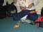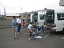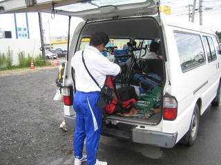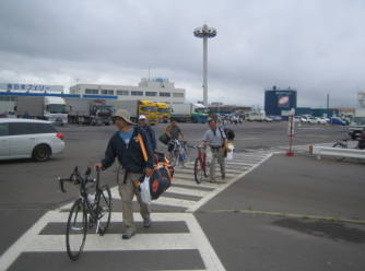 | 7/22大会前日 いよいよ鯵ヶ沢トライアスロン遠征に出発の日が来た。1年ぶりのトライアスロン大会ということもあり、ワクワクして朝はAM5:00前に目が覚めてしまった。外はどんよりとした雲に覆われている。大会当日の天気予報は曇時々雨、何とかバイクの時だけは雨にならないでほしいと祈る。 自分の荷物は、大き目のディバッグ、ドラムバッグに大きいウエストポーチ3つになった。1泊のショート大会とはいえトライアスロンはやはり荷物が多いな。 自分と妻の荷物を車に放り込み、いざ出発! AM8:30にフェリーターミナルに集合ということで、少し早めに到着。既にナベヤくんがターミナルで待っていた。 それから、ぽつらぽつらメンバーが集まってきた。 今回の鯵ヶ沢ツアーは12名、後からカマダ夫妻がJrで追っかけ鯵ヶ沢で合流。函トラメンバーでは他に成田さん、ピーターさん、赤浜さんが別行動で参加である。 今回は新人で若手のナベヤくんとイーヅカくんがリレーの部で参加、どんなレースを見せてくれるか楽しみである。 だんだん函トラも、鯵ヶ沢の参加人数が増えてきたが、人数が多いほど楽しい。逆を返せば北海道内にトライアスロン大会が少ないという事かな?ちょっと寂しいな。来年の室蘭に期待。 フェリー担当はヒロコちゃん、乗船名簿を書くように指示されそれぞれ記入してヒロコちゃんに渡す、そして彼女がまとめて乗船手続きとチケットをもらって来るのだ。 去年、ドジをやらかしているので、抜かりは無い。(^。^)y-.。o○ 青森行きは9:40発で9:00頃から乗船だ。優先順位は自転車、自動車、人の順である。 ![]() 自転車は壁に寄り掛け3〜4台まとめて、係の人がロープで縛って固定するが、防護しないまま縛るので、傷をつけられてはたまらない。 そこで今年は各自、自転車保護用にシートやカバーを持参した。 自分は物置にあった古い毛布を持参し、新車TREKを完全に覆い保護した。しかし、この後悲劇が(この話題はまた後で) さて全員乗船し、2等席に行くと「カトウヒロコ様ご一行予約席」のビラが張ってあり、1画が函トラ専用スペースとして確保されていた。 「うおー、すごいね予約席だ、さすがヒロコ!」とみんなにヨイショされていた。そのときヒロコちゃんの鼻が心持ち高くなった様に感じたのは、私だけ? 青森まで4時間程度かかる。最初は大会やバイクの話、雑誌を読んだりしていたが、だんだん飽きてきた。 早くつかないかなぁ、去年はもっと短く感じたのになぁ・・・(;O・) PM1:30青森到着 下船は自転車が一番最後だ、のんびりと自転車置き場へと下っていく。 毛布をはがし自転車を開放してやる「おおー、4時間の長旅ご苦労さん」と愛車TREKにねぎらいの言葉。 毛布のおかげで心配した傷も無いようだ。しかし!毛布が大きすぎて床に付き、溜まった水をたっぷり吸ってしまった。 折りたたんで持ってみたが、筋トレのダンベルを2つ同時に持っているように重い・・・。うー、こりゃ自転車押しながら毛布を持つのは無理だ!しかも毛布からは函館〜青森間でたっぷり吸った水がジョンジョロリン滴り落ち、身体から放さなければ裾や靴も被害をこうむる事になる。 仕方ないので、自転車はイシヤンにお願いして、毛布を目一杯体から放し、フェリーターミナルまで歩く事にした。この後、この毛布どうしよう・・・来年は引越し用のクッション材にしようっと!(布施パパが使っていました) フェリーから降りると外は小降りながら雨模様、シトシト。少し風もあるかな。みんなの自転車もターミナルの屋根の下で雨宿り。 ここで、3名がレンタカーを借りてくる。ここまで、レンタカーの係員が迎えに来てくれた。車が来るまで他のメンバーはその場で待機。 待つ事約30分、やってきましたマツダボンゴヽ(^o^)丿 自転車8台をボンゴ3台に分乗させる事にした。