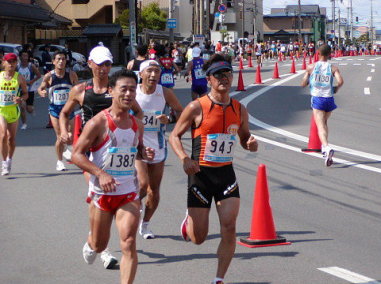 | 澄みきった秋晴れの下、千代台陸上競技場から1560人のランナーが号砲とともにスタートした。 地元函館で唯一の陸連公認ハーフマラソンということで、地元道南のランナーは見んな気合が入っている。 自分は去年8月のオロロントライアスロンでふくらはぎを断裂し、函館ハーフマラソンも10kmで止め、応援に回って寂しい思いをした。 オロロン同様函館ハーフもリベンジを誓っての参加である。 7月、8月と徐々に調子も上がってきている。先週のツールド北海道、ニセコマラソン10kmも良い結果が出ているので、函館ハーフも目標の1時間半を切りたいところである。 ![]() 天候は晴天。会場に着いたときは比較的涼しくそれほど暑さは感じなかった、しかしスタート直前トラックに並び、じ〜っと待っていると、直射日光でじわじわと頭や首が熱くなってきた。エイドでしっかり給水、冷却しないと後で付けが来る。 6月の長万部毛がにロードレースでは前半ペースが速くて、15kmでつぶれてしまった苦い思いがあるので、序盤は5km21分半くらいのペースで行き、後半にかけようと思う。10km42分台で行けば何とか1時間半を切れそうだ。 それから、ガス欠もあったのでレース直前にしっかり補給、念には念を入れカーボショッツとBCAAの錠剤を、後ポケットに忍ばせておいた。 5km手前ヒロコちゃんを発見、オロロンのお返しで「あー、ヒロコに追いついちゃった!」と言おうとしたが、しぶといヒロコちゃんのことだ、後半で逆転されるとかっこ悪いので止めた。 5kmのスプリットタイムは21分02秒、予定よりちょっと良いタイムだ。 青柳町電停手前で折り返した選手が続々とやってくる、アスリートネット仲間では丹代さんが調子良さそうに飛ばしていった、良い順位につけている。 まもなくヤマちゃんが続く。 谷地頭電停の折り返しでは、仲間との距離がどれだけ離れているのかチェックできる。高谷会長は200m〜300m前にいた、ウエアが派手なのですぐ分かる。 栄町辺り(7Km位)で棟方選手に追いつき、しばらく一緒に走る。そのあとM谷さんが軽やかに抜き去っていったが、そのペースには付いていけない。 沿道で会社の人が応援してくれたので手を振り応える、結構こちらから応援の人を探す余裕もまだある。 このあと松風町の交差点から大森稲荷神社方向に右折、ここから来たルートから離れ、湯の川の折り返し地点に向かって海岸線を走ることになる。 海岸線に入り風が気になるところである。例年、浜風が選手を苦しめるルートだ。 大森稲荷を左折し宇賀の浦中学校前(9km位)で、後方からシンちゃんが上がってきた、ふと気がつくと隣にはスギさんもいるではないか、更にその後にエンドウさん。 「うわー、すげー身内の戦いだ!」100m程先にはM谷さんも見えている。 シンちゃんの後に続き10km地点、ラップは21分47秒、スプリット42分50秒 ほぼイーブンペース、これなら何とかなりそう。この200m先に給水ポイントがあるので、サプリメントを補給。まずはカーボショッツ、相変わらず甘ったるい、続いてBCAAの錠剤2粒を口にほおばり、左右で1錠ずつ噛み砕く、その後更に2錠。 これはかなりテクニックがいる、呼吸が苦しい・・・ウグッ!(゜o゜)「鼻が詰まったランナーは絶対無理だろうな」などとくだらない事を考える。 よーし!これで後半ガス欠はないだろう。 その先に啄木公園があるがここは応援がかなり多い。この海岸沿いは通称「いさり火通り」を言われ、イカ釣りシーズンともなると津軽海峡の水平線に、煌々といさり火が見える。 しばらくシンちゃんが先頭を引っ張り、その後を3人が追走する、なかなか良いペースだ。 広野町の競輪場通りを過ぎた辺りで、トップ集団が向かいから来た、かなり速いペースのようだ。すれ違うポイントがいつもより少し手前である。 その後、湯浜で仲間達が走り抜けていく。丹代さんは以前、好位置につけている。 ![]() 折り返し少し手前(13km位)平成館前で専属カメラマンのイシヤンが待ち構えているのが見えた。シンちゃんの左側に並び、ベストポジションでパチリ! 折り返しが見えてきた、その手前に給水ポイント。紙コップを取り、一口だけ含んだ。 大きな3角錐を左回りに折り返す。少し風が出てきた、向かい風だ。 ここでスギさんが前に出たのでピタリ後につく、ここからコバンザメ走法に切り替えた。 折り返してからは選手達に疲れが出てくる頃なので、だんだんペースが落ちてくるものも多い。ここからが勝負だ。 ここは共同戦線ということでスギさんと協力しながら走ることにした。 「スギさん先頭交替で行こう!」と言いながら、しばらく前に出れなかったが・・・。 エンドウさんはっこからペースを上げて先に行ってしまった。シンちゃんは後にいるはずだが、振り向く余裕はない。 往路を走ってくる選手が怒涛のようにやってくる、仲間には手を挙げ合図する。 15km地点、ラップ21分32秒、スプリット1時間4分22秒、ここまでもほぼイーブンペース。 広野町(16km過ぎ)で