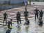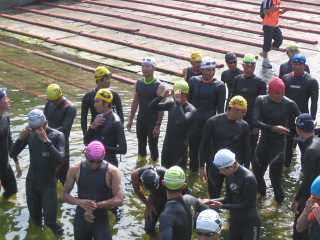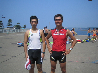 室蘭チャレンジ・アクアスロン2006に参加してきました。この日、今年一番の真夏日となり、暑くてランはバテバテ。 コースは港内を途中で右に折れ戻ってくる、750mを2周回の1.5km。波は全く無く、水温もまあまあということで、コンディションは最高。 ただし、中間のブイが一つずつでコースロープも無いため、ヘッドアップスイムができない選手はちょっと辛いかもしれない。 ランコースは、測量山公園折り返しで、ほとんどが坂道(アップダウンの連続)というハードな設定の12km、しかも砂利道が多かったため、上り下りとも走りづらかった。 AM8:10頃会場に到着、B&G海洋センターで受付をして8:30から競技説明会、9:30スタートと時間的には余裕の無いスケジュールだったかな。 しかし、まあ練習会という位置づけのため終始和やかな雰囲気で、ピリピリした感じは全くない。 ![]() 参加者33名とはいえ、名簿を見ると札幌のパッシュた3in1、エッジ、苫トラ、北大等の強豪メンバーがずらり。練習会とはいえ、その辺の連中はみな本気モード。 スイムは最前列に並びスタートダッシュで何とか先頭集団に入りながら着いていこうという作戦。 人数が少ないのでインコースを取る事にした。 秒読み開始3・2・1スタート! で横にいた森谷さんに付いて行こうとダッシュしたのですが予想以上に速く、どんどん離されてしまった。 これ以上ペースをあげると後が持たない、目標を他の選手に切り替えよう。 幸いすぐ近くに2〜3名?同じペースの選手がいたので、ペースを合わせ、付かず離れず間隔を取る。 コースロープが無いので、ヘッドアップでこまめにコーナーのブイを確認し、方向修正しながら泳ぐ。 最初のコーナーはほとんど込み合わない状態で楽々右折、しかしその次が問題。次のブイまで距離があるので、目標を確認しづらい、すぐ他に目標となるものを探した。 あった、 後ろにそびえ立つ風力発電の風車のちょっと右側がブイだ。風車の左に出ないように修正しながら泳ぐ。750mを2周回なので、以外に早く1周目を終え2周回目に突入。バトルも無いので足もそれほど使っていないし、体力的にも余裕あり。2周回目もコース蛇行せず良いペースです。 結局スイムでは6位の好位置で上がりランへ突入。 7月の鯵ヶ沢トライアスロンではソックスを履かずに走ったが、ランコースがほとんど坂道で、踵が靴擦れで血染めになってしまった。 今日もアップダウンの厳しいコースと聞いていたので、安全策を取りソックスを履くことにした。 小ぶりの洗濯カゴに入ったラン用品を身につけ、いざランへ! ランコースに入ると真夏日の暑い洗礼を受けた。「これは厳しくなりそう」 すぐ目の前に女子選手がいたが、ペースを上げすぐ抜いた。(すぐでもないか・・・) 1kmも行かないうちに上り坂が目の前に迫ってきた。 後ろから、一人また一人と速い選手が軽々と上って追い抜いていく。(身体が重ーい!あと3kg体重軽ければいいのに) なんせ苦手な上りの多いコースのため5〜6人ボロボロ抜かれました。最後は根性でチームエッジの一人を抜き返しましたが・・・。結局11位まで落ちました、トホホホ・・・。 うちのメンバーの記録は下記のとおりです。 総合記録 スイム ラン 前田紀幸1:19:36(11位)25:33(6位)54:03(12位) 成田実 1:26:00(15位)29:43(17位)56:17(17位) 棟方潔 1:26:11(16位)30:59(20位)55:12(15位) 森智希 1:32:38(22位)30:51(19位)1:01:47(23位) 多田明広1:48:07(30位)38:41(29位)1:09:26(28位) 北海道の新たなトライアスロンの1ページとなるべく、来年はみんなで室蘭トライアスロンに行きましょうね!! ![]() |