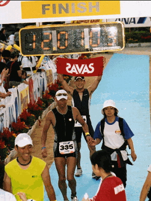 〜ランパート〜![]() トランジッションは随分混んでいた。 高校生らしき男の子が良心的に一人づつサポートしてくれる、ありがたい。 函トラ応援団の熱烈声援を受け42.195kmスタートする。 トライアスロンを始めて気が付いた事だが、バイク後のランはスピードド感覚が大幅に狂ってるようだ、約3km地点だろうか? 中西さんとすれ違う、脚が痙攣しているようだが歩を進めている。 復活を願いつつ自分も次の折り返しへ向かう、約6km地点、復活した中西さんとすれ違う、「さすがだ!」10分くらいの差だろうか?20km地点では追いつかれているだろう。 それにしても暑い、MAEさんがオロロンで復活した「両肩にスポンジを挟むゾ」作戦をしようと思ったが、スポンジはどこのエイドでも無いようだ。 しからば槇本先生が使った、「帽子に氷」作戦だ、自分の場合は頭が凍傷になる恐れがあるが仕方あるまい。 キロ6分台まで落としたが呼吸は荒いままだ、水、CCD、コーラ、BCAA、塩など交互に取るが、一向に良くならない、何がナンダか解らない?? ![]() 10km地点で今泉奈緒美、16km地点で塩野絵美に周回遅れにされながらも何とか函トラ応援団に激を貰い2周回へと向かった。残り18km、とにかく我慢だ。 それにしても、ここ五島島民の応援は熱烈だ!島民全員が応援してくれていると思うくらい、家がある所には必ず応援者がいる。 そして、元気なおじいちゃん,おばあちゃんが多い。南国気質なんだろうか?何かを叩きながらも楽しんでいるようだ。 ![]() 何度名前を呼ばれたろう、何度「北海道からありがとう」と言われただろう、こちらこそ「ありがとう」です。 オロロンの時もそうでしたが、30kmを超えるあたりからはもう自分の力だけで走りきれる領域ではないと思いました。 その、土地土地での熱い声援と、喜びも不案も分かち合える仲間からの応援と想いが、脚が止まろうとするきっかけを奪 っている。 五島の街並みに入ると残り3km、沿道の応援が多くなり、ゴールに近づくにしたがって「ガンバレ!」「キバレ!」から「おかえり!」に変わってきた。 ![]() 太鼓に導かれるように城内に入ると、妻が待っていた。 トライアスロンジャパンで見たことのある花道を進むとフィニッシュゲートが見えた。 前が詰まっていたので残念ながら ガッツポーズが決められなかったが、フィニッシュゲートをくぐった瞬間、今までの困難が何かへと昇華されたような気がした。 |