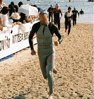 | 6月17日(日)AM7:00スタート 〜スイムパート〜 アイアンマンのスイムは3.8kmです。 二等辺三角形を逆にした形で約900m沖に出、波と平行に200mほどを泳ぎ右折、ビーチに波と平行に200mほどを泳ぎ右折、ビーチに戻り、いったん浜に上がってコーンを廻り2周目へと向かいます。 昨日の試泳の時は波、うねりが高く、波頭の時には足が空打ちし、谷の時には海老反りになり、最悪波酔いになりそうなほどでした。 ところが当日、昨日とは打って変わって無風ベタなぎ状態、過去7年間で最高のコンディションだそうです。 約800名がスタートする為、沖合い100mで立ち泳ぎしてます。函トラチームの4名は先頭から10mほど後方、全体から見るとかなり前のロープ際に位置しました。 密度的には1メートル四方に5,6人、一斉に泳ぎ始めるとどうなるか想像がつくでしょうか? ホーンが鳴り、エリートがスタートしました、誰かがシュプレヒコールのような雄たけびを上げ、みんながつられて拳を突き上げテンションが高まります。 2分後、2度目のホーンが鳴り、さぁエイジのスタートです。 ![]() 頭を叩かれるのは当たり前、呼吸しようと思うタイミングで沈められたり、そうかと思うと、コースロープを手繰り寄せ、忍者のように進むヤツ、一定のリズムで足首を掴んでくるヤツ、「なにをしたいんだ?」と言いたくなる位見事なまでに曲がってくるヤツ、指でゴーグルが引っ掛けられそうになった時には焦りましたが、1周目の後半には適度に散らばり、泳ぎに専念できました。 いったん浜へ上がり、すぐに函トラ応援団を発見! 見事なまでの位置取り(笑)、時計を見ると35分台だ、小さくガッツポーズして2周目へ。 2周目になるとバトルが無い分だけ余裕が出てきます。ゆったりとしたピッチでしか泳げないので、海底の様子を楽しみながら泳ぎました。 真っ青で熱帯魚のような小さな魚もたくさんいましたヨ。 ![]() ヘッドアップが苦手ですが、ロープ沿いを泳いでいたので潮の流れへの対応も出来ました。 最大限ウエットスーツの恩恵を受けてスイムアップ。 |