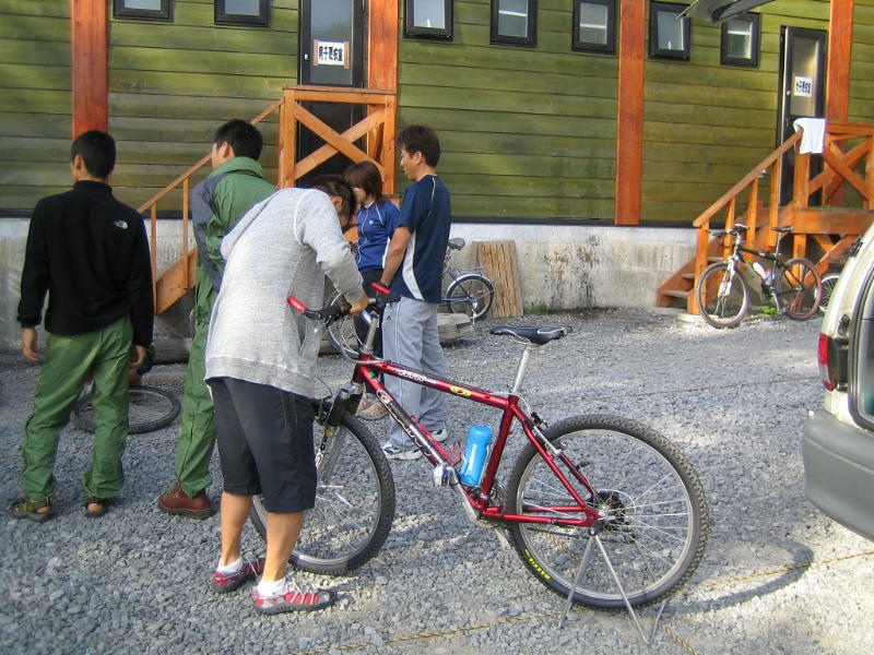 パンク修理講習会の脇で前輪をはめてま〜す
