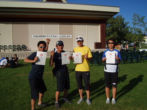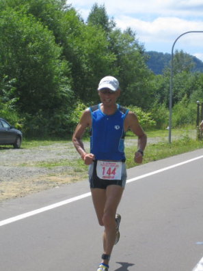 | 【SWIM編】 最前列には招待の有名選手が並んでいる。 アイアンマンジャパンで日本人2位になった益田大貴プロ、デュアスロン女子日本チャンピオンの斎藤愛里選手、昨年のこの大会の優勝者、吉越慎吾選手など、雑誌トライアスロンジャパンに良く出ている選手が間近にいる。 その並び、ほぼ最前列と言って良い位置にMAEさん、イーヅカ、布施Jrの函トラスイムお達者トリオが陣取っている。 自分は実力差も考えず、すぐその後ろに待機し、「速い人の後ろってポッカリ、スペースが空くかもね〜」っと、後で痛い目に遭うとも知らずに呑気に構えていた。 「パーン!」 普段見る空の色よりも濃い目の青にスタートの合図が響く。 泳ぎ始めて間もなく、濁っているため「前の人の足が見えないなぁ」と、思っていたらはじまりました。お約束のバトルです。 しかも、今までに経験の無いほどの・・・ 後ろに並んでいた速い選手がもの凄いスピードで自分の背中をほふく前進して行きます。 「コース幅そんなに狭くないだろう?」と、思うほど、人の背中をまるで通り道のように何人もが乗っかってきます。牽制するキックも役に立ちません。 「呼吸ができない」苦しくて顔を上げる。足が下がりスピードが落ち、また乗られる。沈む。 水中が濁っていて見えないので仕方ありませんが、トライアスリートは遠慮がありません(笑) スイムでは30分を切るのが目標でしたがタイム云々言っていられる状況では無くなりました。様々な後ろ向きな言葉が頭をよぎります。 いつでも休んで呼吸を整えられるように10mほど離れているコースロープにゆっくり近づいた。それが正解でした。 まだ込み合っているものの、先ほどのバトルから比べると可愛いものです。 とにかく呼吸を整えようと「ゆっくり、ゆっくり」と、自分に言い聞かせながら泳いだ。徐々に周りが見えるようになった。 斎藤君がいる。成田さんがいる。仲間が頑張っているのを見ると先ほどの後ろ向きな言葉が消えてしまうから不思議なものだ。 当日の湖面は風が強く、波があり、不意に大雪山のミネラルウォーターを補給させられたが、スイムコースの三角形の2辺を回る頃にようやく1500m泳ぎ切れる自信を持つことができた。 スイムアップしてから、遅れを取り戻そうとトランジッションまでの階段を「トリャ〜〜!」と、一段飛ばしで上ったら一気にバテタ・・・(ウマシカ馬鹿!) 【BIKE編】 いらないところで体力を使ってしまい、トランジッションはイメージ通りとはいかなかったが、以外にも残っているバイクの多さに驚いた。 今までのレースでは良くて中位だったが、今回は3分の2、いや4分の3が残っているようだった。一瞬、嬉しく思ったが、タイムを見ると良くも無いので冷静にバイクコースへと向かった。 このコースは高速コースのようなので、目標の1:15′に近づけるか楽しみだ。 また、周回コースなので、前後の函トラメンバーとの間合いが分かって面白い。 スイムお達者トリオはもちろん、成田さんやスイム急成長の斎藤君も前にいることだろう。 ランパートで絡み合いたいのでこのバイクパートで少しでも差を縮めておきたいところだ。 ゆるやかな上りやトンネルを超えると長い下りになった。DHポジションのまま曲り下る。 「ウォ〜〜 気持ちイィ〜〜〜!」 60km/hは優に越えている。下りから平坦になったが40km/hオーバーのまま折り返しに着いた。 あまり気持ち良くペダルを漕げたので前を行くメンバーを確認できなかった。 さぁ復 6月にSTIレバーのワイヤーに指を引っかけて前転落車してから、シフターをDHバーの先端に付けるバーエンドコントロールにしたのだが、アウターからインナーへの切り替えでよくチェーンを落としてしまうので、出来ることならアウターのまま登り切りたい。 折り返して間もなく、成田さんが来た。どうやらスイムでほんの少し先行できたようだ。登りに入ってから鎌田さんともすれ違う。 上りのキツソーなところでメーターに目をやると20台km/hだ。 ギヤも余っている。3周回目にペースダウンしてもアウターのまま行けそうだ。少しホっとして前を追う。 バイクパートでは、暑さはさほど気にならないが、1kmほどのトンネルは涼しくて気持ちが良い。 スタート側を折り返し、2周目に向かうと、ひとみさん、妻、リレーの部のスイムパートを終えた小杉さんが応援してくれている。ありがとう! 今度は慎重に間合いを把握したい。 折り返し1km手前で、イーヅカ、MAEさんらしき選手を発見!布施Jrはレースウェアを確認していなかったので、分からなかったがもっと前にいることだろう。 距離2kmタイム差にして4分弱だろうか? 次の周回に縮まっているのか、広がっているのかを確認したい。 2回目の登りでスイムでは5分以上離されていたと思う沢本さんに追いついた。 バイクを漕ぐ姿はきつそうだが、いつもの笑顔はさすがだ! 軽く声をかけ抜く。 2周目復路のトンネルで突然「ウェ〜〜〜〜〜」と、苦しむ大きな声が響