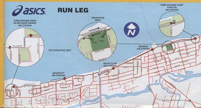 桟橋を通り過ぎると広い公園の中を走るのだが、特にコースが決まっている風はないので、好きなところを走りまた海沿いのコースへ戻り、更に住宅街へ入っていく。このコースは今までのアイアンマンとは異なり、完全に生活道路をランコースにしており、普通の住宅街の中をくねくねと走っていくようにできている。したがって応援している人々も家の前で応援しているという形で、アットホームな雰囲気である。 http://www13.ocn.ne.jp/~bunkame/result_051127.htmlより引用